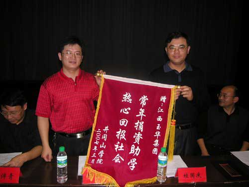 黄东来先生代表江西玉华集团董事长王佑任先生及全体员工,向荣获玉华奖学金的各位同学表示热烈的祝贺。希望同学们能够珍惜这次获奖的荣誉和机会,更加刻苦地学习科学文化知识,为将来施展个人抱负奠定一个坚实的基础。他说“以人为本、扶贫助困、关爱社会”是玉华集团一贯的追求,为此集团每年捐助8万余元,在井冈山学院设立扶贫助学奖学金,帮助那些经济困难的莘莘学子度过难关,顺利完成学业,也以此倡议社会各界都能携起手来,伸出援助之手,奉献一份爱心,为那些贫困学生编织出一片希望的蓝天。他说,玉华集团诚挚欢迎井冈山学院有志于玉华事业的学子的加入,用朝气蓬勃的风采使玉华永远年轻,用才华和汗水使玉华永远艳丽。