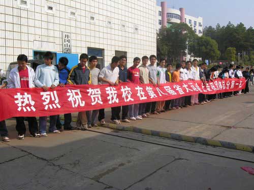11月13日,我校参加第八届省大学生运动会的代表载誉归来,副校长桂国庆、康泰、罗学渭、肖蕴诗等到校门口迎接并和运动员合影留念。