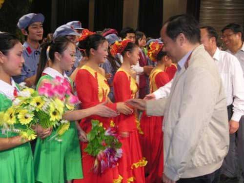 演出结束时,李永盛在万继抗、张泰城等陪同下,走上舞台接见全体演员,祝贺演出成功。李永盛说,非常高兴有机会在井冈山学院欣赏音乐舞蹈史诗《井冈山》这台节目,感谢全体演职员让我们享受了一次精神大餐,使我们深受教育,深受鼓舞。我们来到井冈山学院,就始终感受到了浓浓的亲情,我们完全相信,对口支援工作会结出丰硕的成果。同时我也期待着音乐舞蹈史诗《井冈山》能早日在同济大学演出。