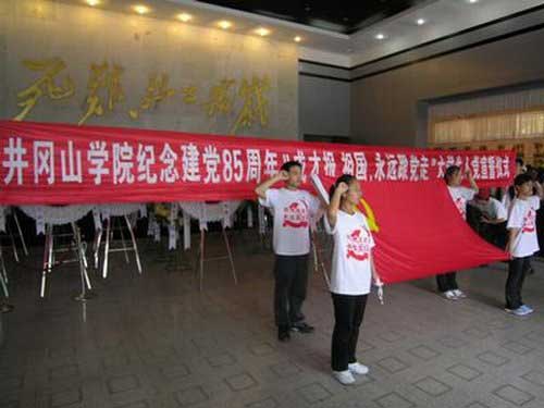6月24日,我校30名大学生新党员来到井冈山主峰五指山下的井冈湖畔,以崇敬的心情提取了象征井冈山精神的革命圣水,学校将于近日派信息与传媒学院03级大学生、新党员赵若诚将取自井冈山的水护送到浙江嘉兴。当日,我校大学生新党员还在井冈山革命烈士陵园举行了入党宣誓仪式,并向革命烈士敬献了花圈。校党委副书记孙甦等也与大学生一起参加了活动,组织部部长龙学先、宣传部部长肖长春、团委书记易九桂、副书记杨芳等也参加了活动。
