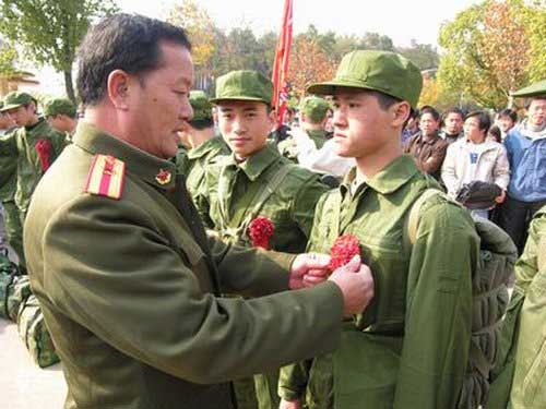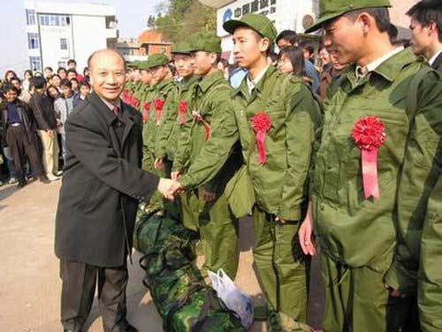 校领导和新兵合影 武装部部长廖万民为新兵戴花