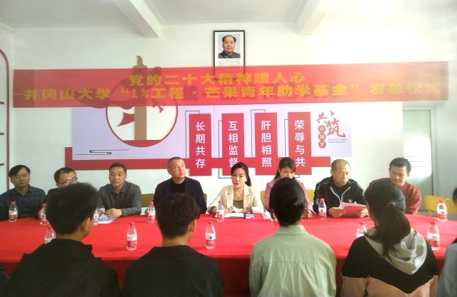 4月12日,民进江西省委会“1%工程·芒果青年助学基金”发放仪式在井冈山大学“民主党派之家”举行。江西芒果青年实业有限公司副总裁徐岷、市场总监徐肖肖,民进吉安市委会专职副主委谢文斌出席,学校党委统战部、团委等部门负责人以及民进井冈山大学总支主要成员和10名受助学生参加了仪式。