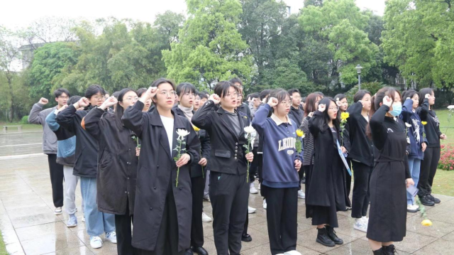 上午9时许,冒着淅淅沥沥的小雨,“闪闪红星”班成员和团委学生会成员队列整齐地站立于烈士纪念碑前,神情肃穆,默哀三分钟,缅怀为祖国、为人民牺牲的革命先烈。全体人员依次上前向烈士敬献鲜花,瞻仰烈士纪念碑,向烈士鞠躬,表达对英雄先烈的崇高敬意和无限怀思。