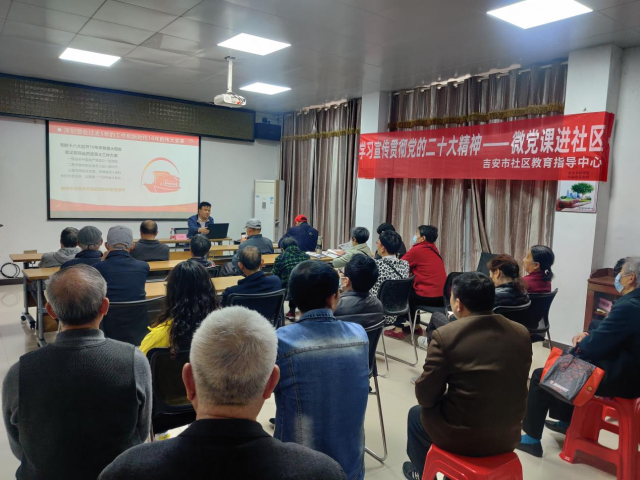 为贯彻党中央有关党史学习教育常态化长效化的有关要求,扎实开展好“我为群众办实事”实践活动, 3月13日,井冈山大学继续教育与培训学院、吉安开放大学党支部书记王志民带领支部党员、群众,以吉安社区教育指导中心为平台,在吉州区永叔街道青石社区党群服务中心开展“学习宣传贯彻党的二十大精神——微党课进社区”活动,30余名居民群众参加了此次讲座。
