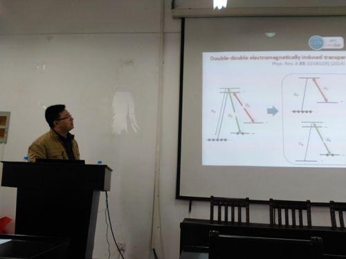 11月24日上午,上海同济大学物理科学与工程学院朱成杰教授举办了以《相干制备原子气体中光的操控与传播维持性研究》为主题的学术讲座。数理学院相关专业师生聆听了此次讲座。朱成杰教授深入浅出的阐述了电磁诱导透明以及拉曼增益的相关原理,介绍了该领域的研究进展。通过与在场师生分享自身的研究经历,朱成杰教授带领大家进一步了解了该领域的研究热点。整场报告持续了近一个小时,现场气氛十分热烈。报告结束后,面对现场学生的踊跃提问,朱教授都耐心的给予了详细的解答。本次讲座,不仅让数理学院师生了解了理论物理相关领域的研究进展,开拓了专业视野,而且更进一步促进了数理学院与同济大学的学术交流,营造了良好的对外学术交流气氛。(数理学院)