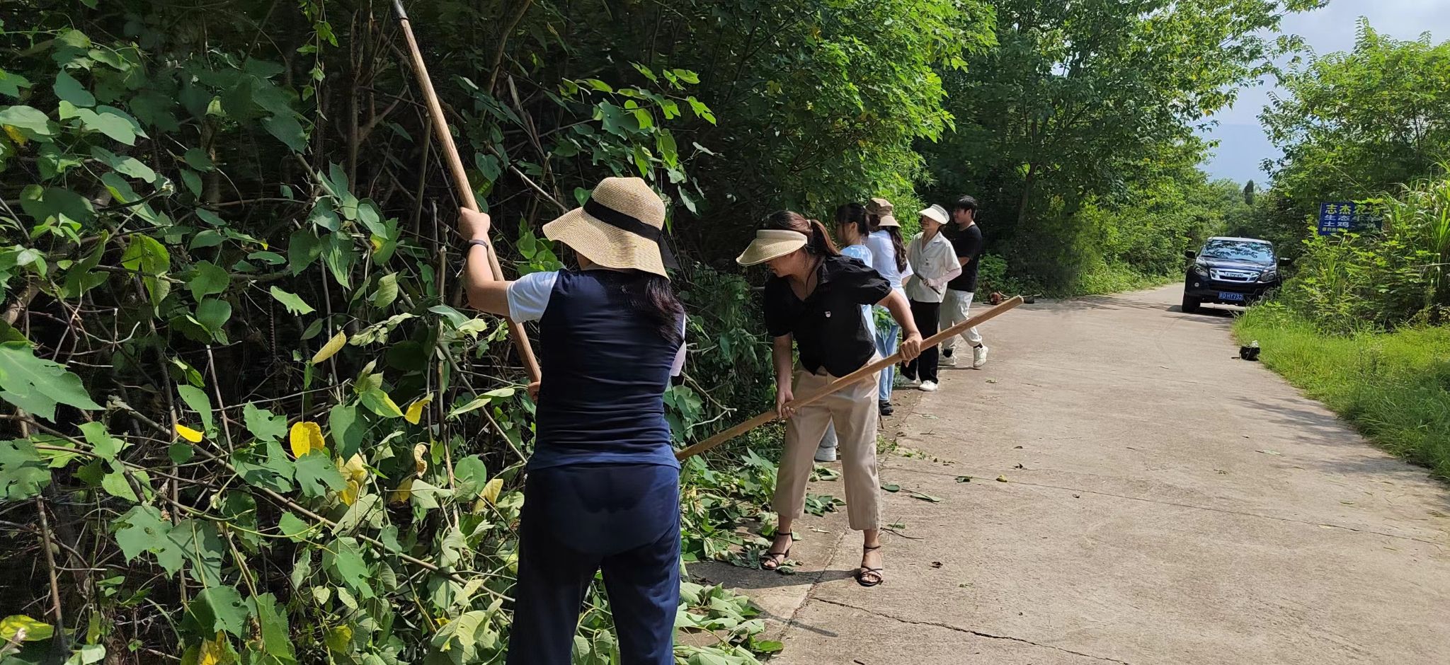 入夏以来,炎热多雨的天气使农村道路两旁杂草丛生,不但成为蚊虫滋生的场所,而且由于村道狭窄,会车时杂草遮住视线,给居民出行造成了较大的安全隐患。活动中,党员和村干部们充分发扬不怕苦、不怕累,不怕脏的精神,在2个多小时挥汗如雨的“奋战”中,利用砍刀、铁锹、大扫把等工具对乡村道路两侧的杂草、荆棘等进行了全面清理和矮化处理。全村道路焕然一新,道路视野拓展了,村容村貌美化了。