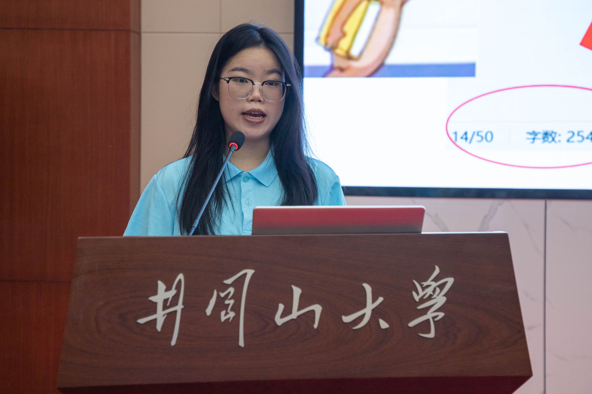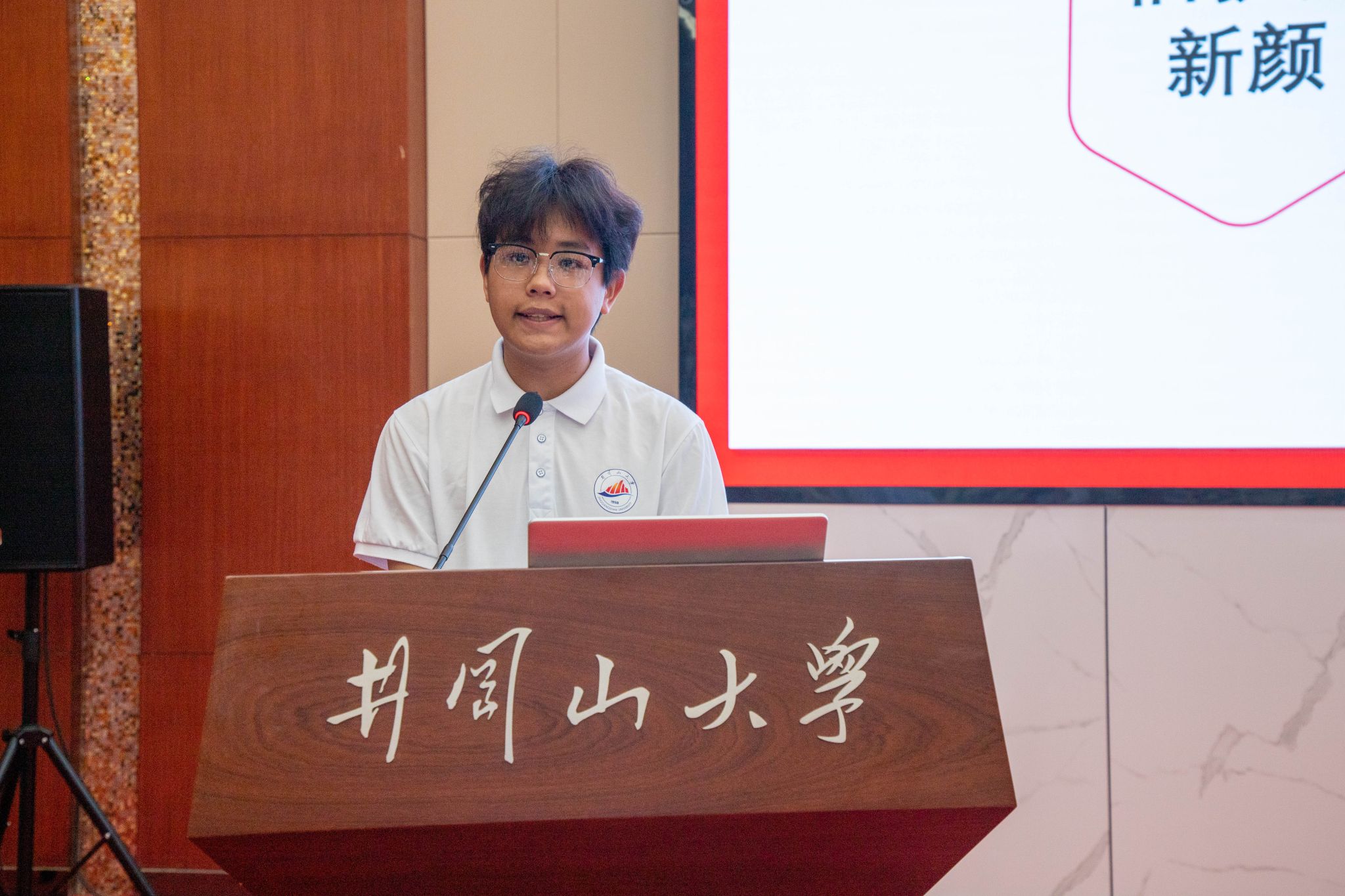 宣讲会上,七名青年榜样代表围绕青年成长,创新创业、志愿服务、社会实践等方面分享自己的青春实践奋斗故事。外国语学院江南同学以《书写时代答卷,开创青春新篇》为题,从团学工作经历、暑期调研实践、学习竞赛历程方面展开阐述,展现了服务同学、深入社会实践、积极参加学术活动的新时代青年风貌,并表示作为一名新时代青年,将坚定理想信念、练就过硬本领,书写时代答卷、开创青春新篇。