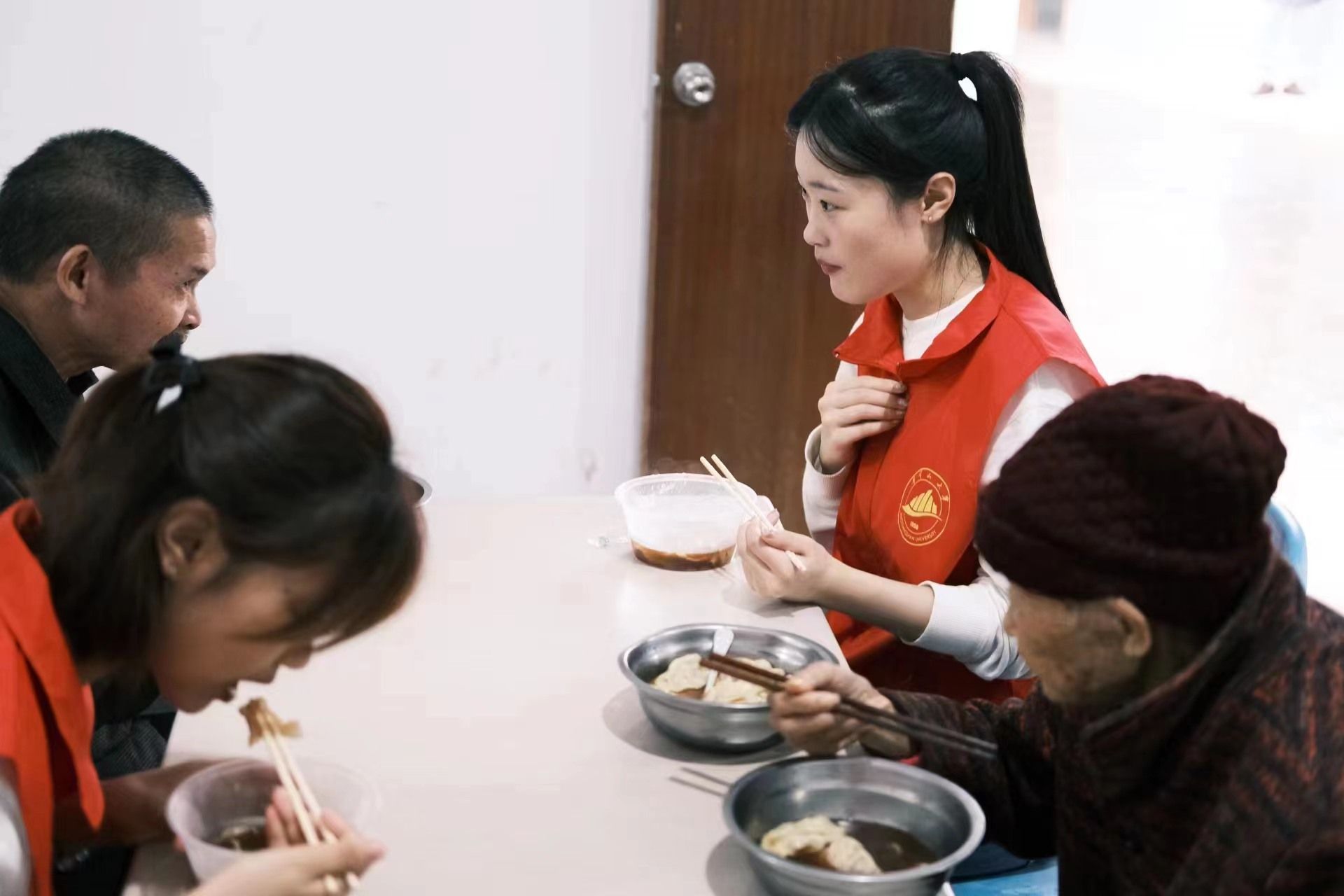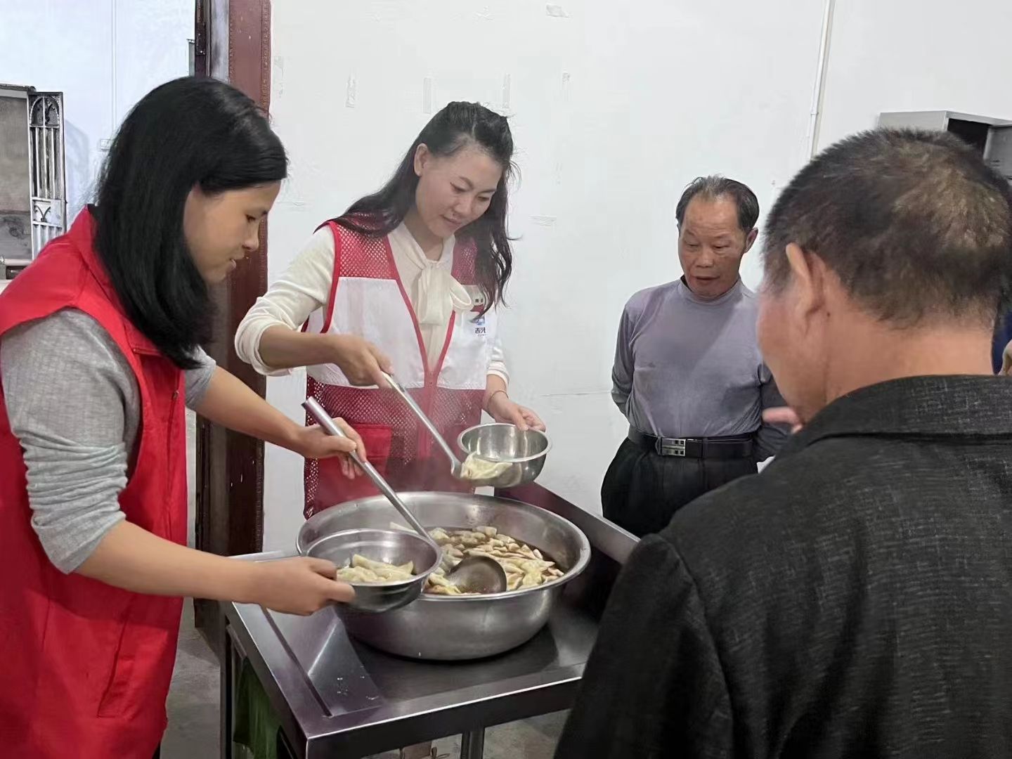敬老院厨房内下饺子的热气升腾。饺子出锅后,政法学院学生第一党支部书记杨婷和吉安市科技技工学校党支部副书记徐娟分别为老人们盛饺子。一碗碗热气腾腾的“孝心饭”端到老人们面前,志愿者们与老人们同席而食,边吃、边听、边聊,老人们吃在嘴里,暖在心上,欢声笑语此起彼伏。