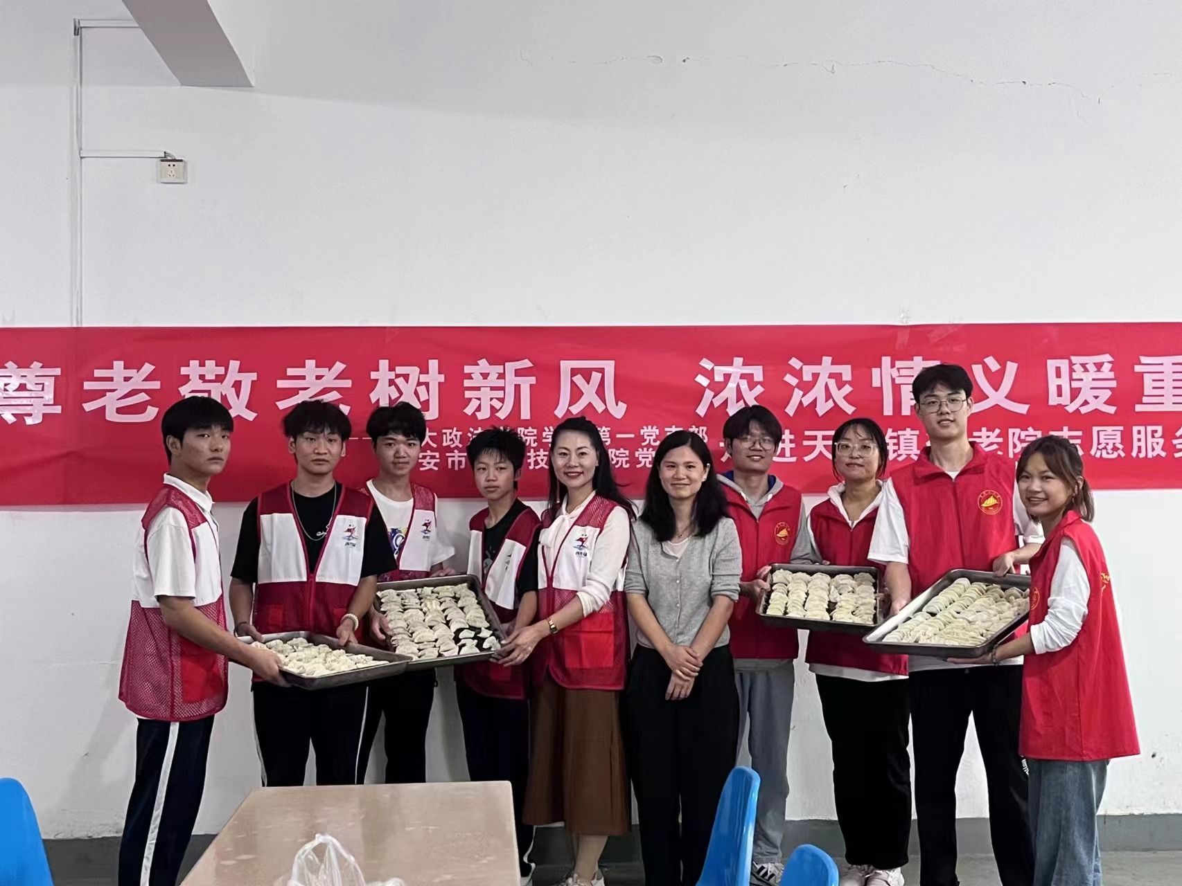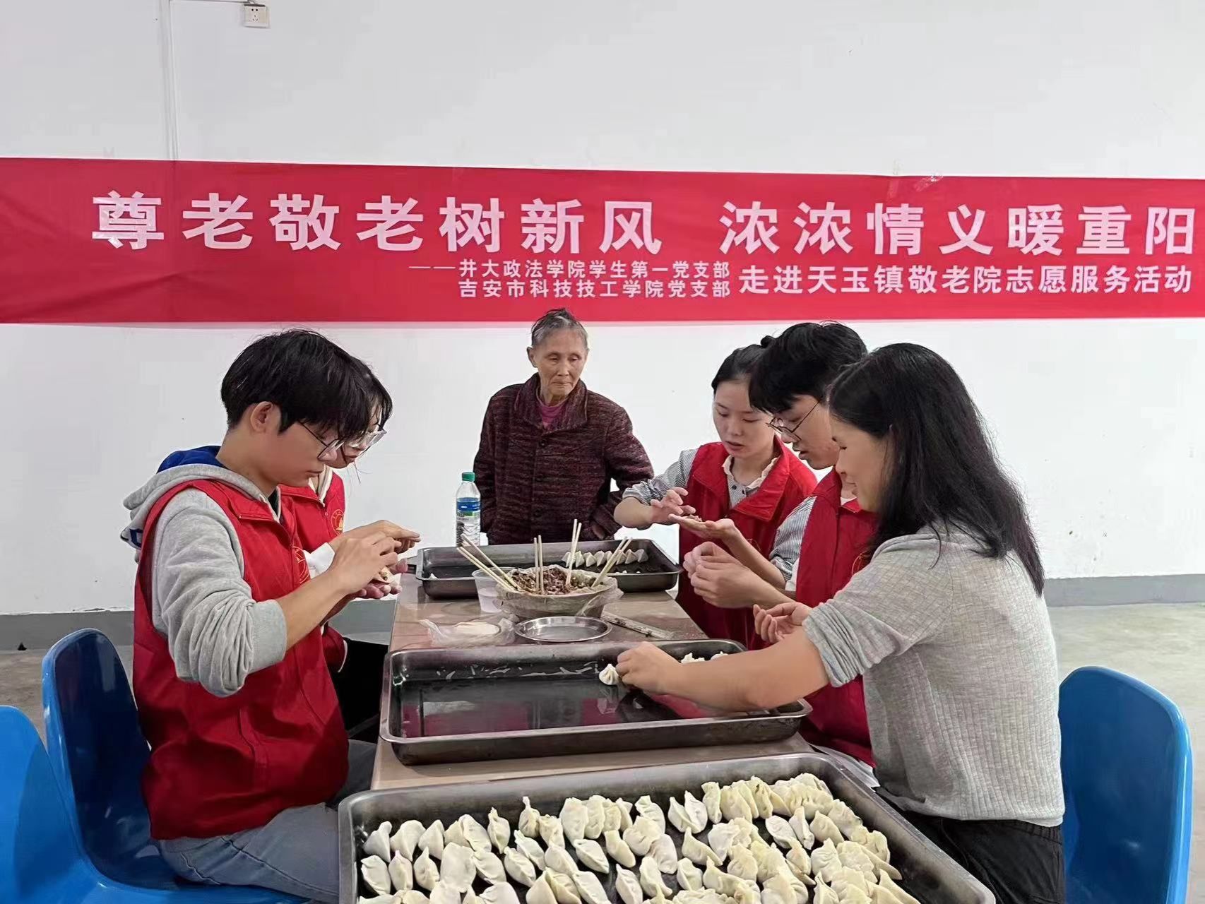 临近重阳佳节,为弘扬社会主义核心价值观和中华民族传统美德,践行尊老、敬老、爱老、助老美德,2023年10月19日,井冈山大学政法学院学生第一党支部携手吉安市科技技工学校党支部迎着秋雨桂香来到了天玉镇敬老院,将温情融进老人的心中,拂去老人心中的孤单,用实际行动给老人们送去关怀和温暖。