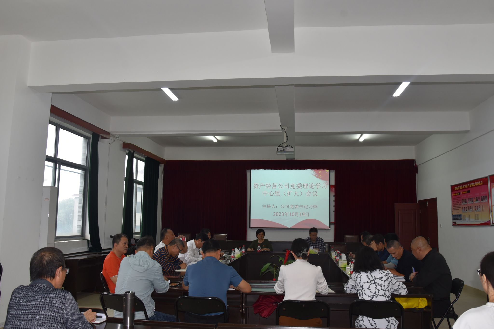 10月19日下午,资产经营公司召开党委理论学习中心组(扩大)会议,会议由公司党委书记习萍主持,全体党员参加会议。
