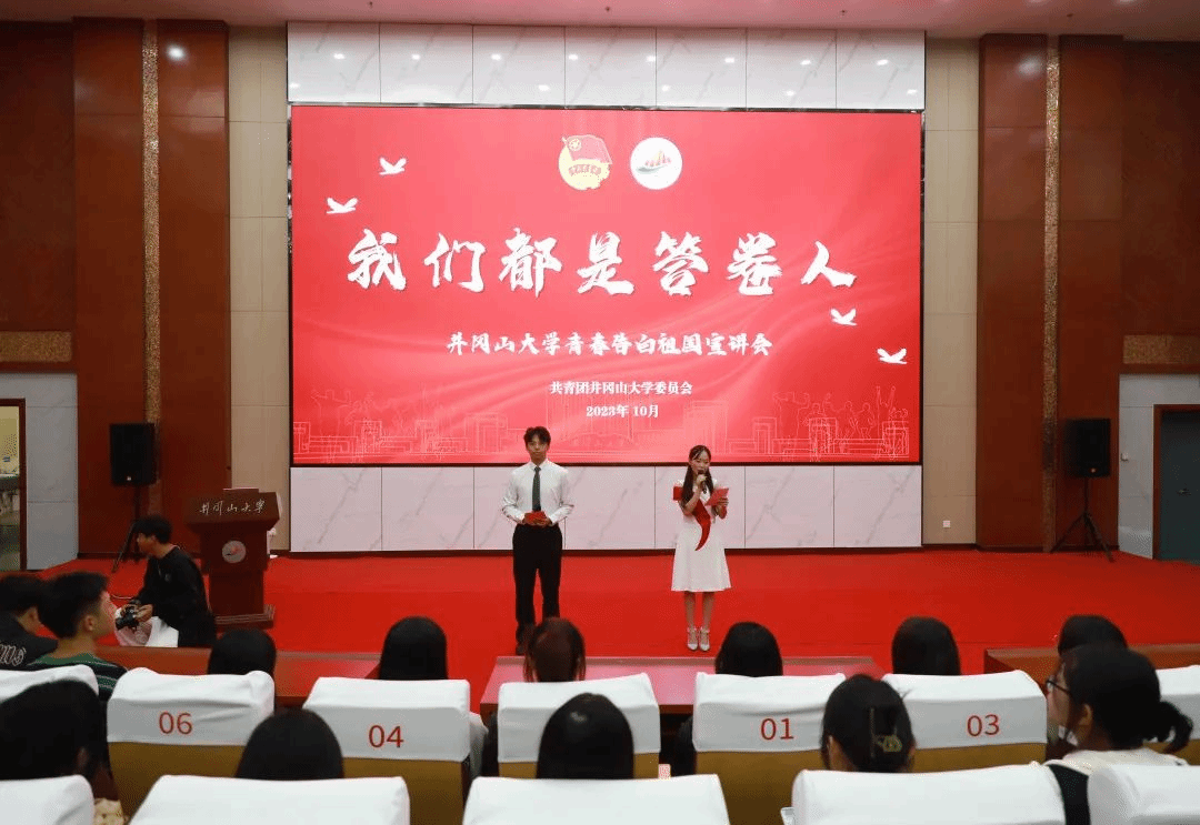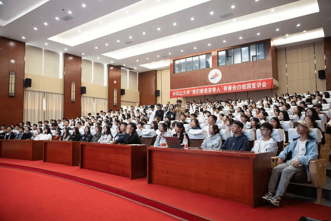 10月12日下午,井冈山大学团委组织的“我们都是答卷人”——青春告白祖国宣讲会在新图书馆报告厅顺利举行,校团委学生会工作人员、“青马工程”大骨班学员,青年学生代表参加了此次活动,同时开启线上直播,6000余名学生线上线下共同聆听宣讲。