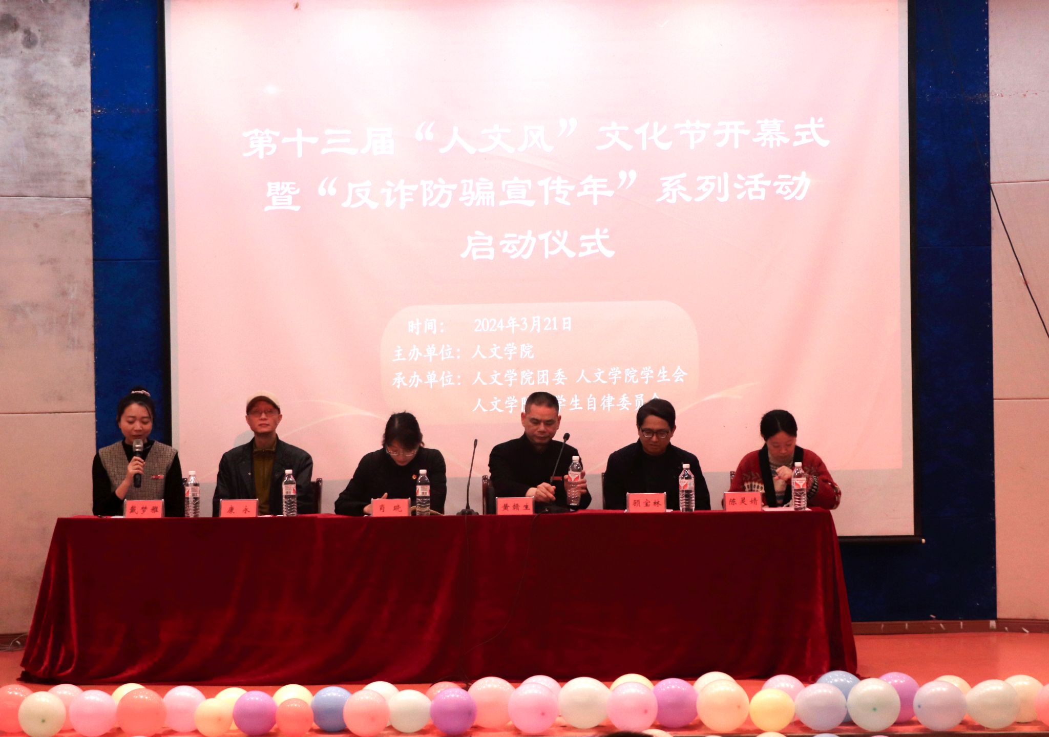 千枝万树繁花锦,丝竹悠扬雅乐欣。3月21日,人文学院第十三届“人文风”文化艺术节开幕式暨“反诈防骗宣传年”启动仪式隆重举行。校团委书记肖晓、保卫处(武装部)处长(部长)黄赣生、人文学院党委书记康永、副院长顾宝林出席,开幕式由学院团委书记、学生科长戴梦雅主持。