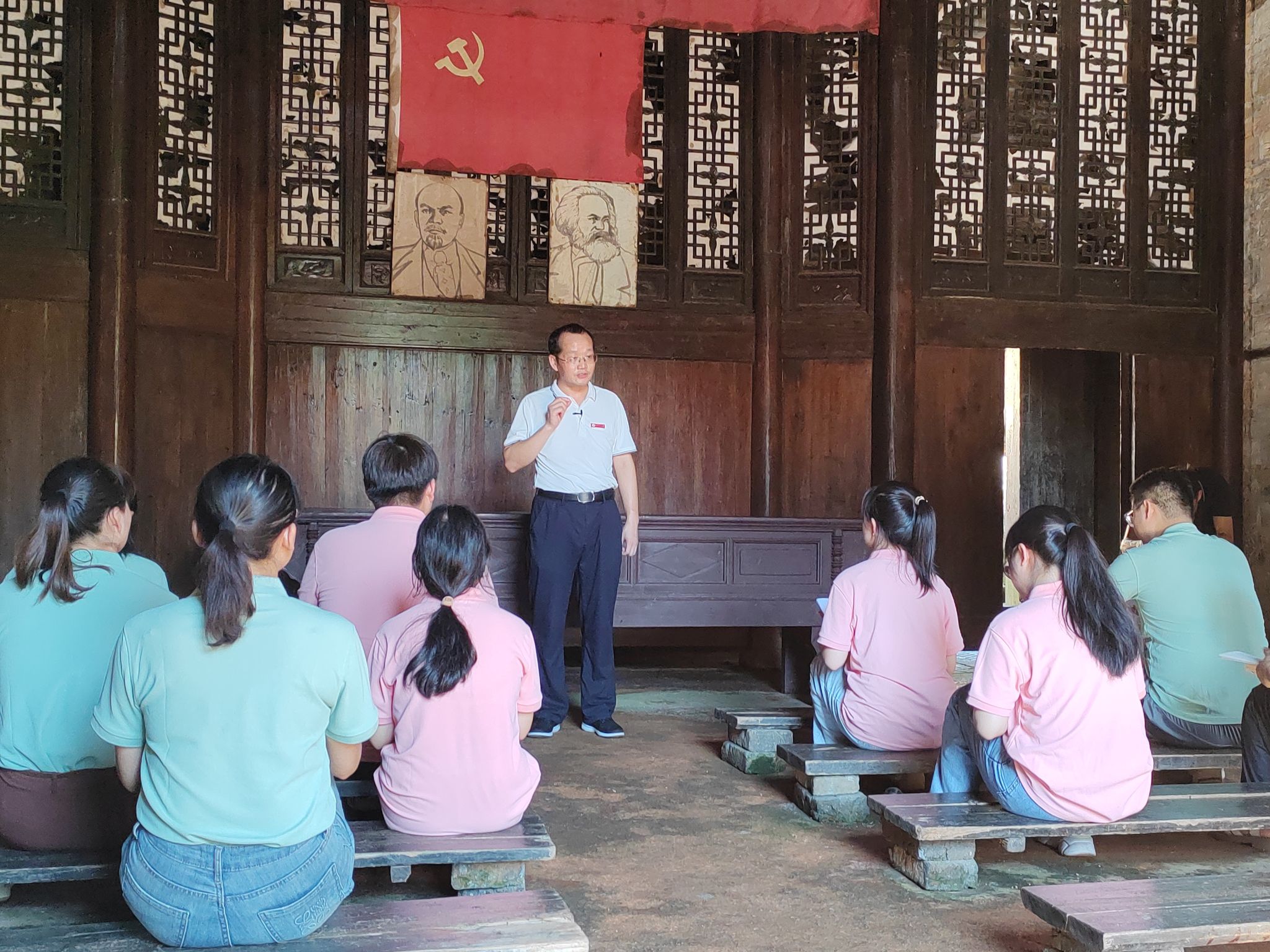 实践活动开展期间,井冈山大学党委常委、副校长敖四江来到八角楼革命旧址群亲切看望慰问暑期社会实践团队的同学们,并为青年大学生上了一堂别开生面的思政微课。在八角楼毛泽东旧居的清油灯前,敖四江副校长与青年大学生进行了交流和讨论。同学们分享了自己学习两篇红色经典著作的感悟和收获。