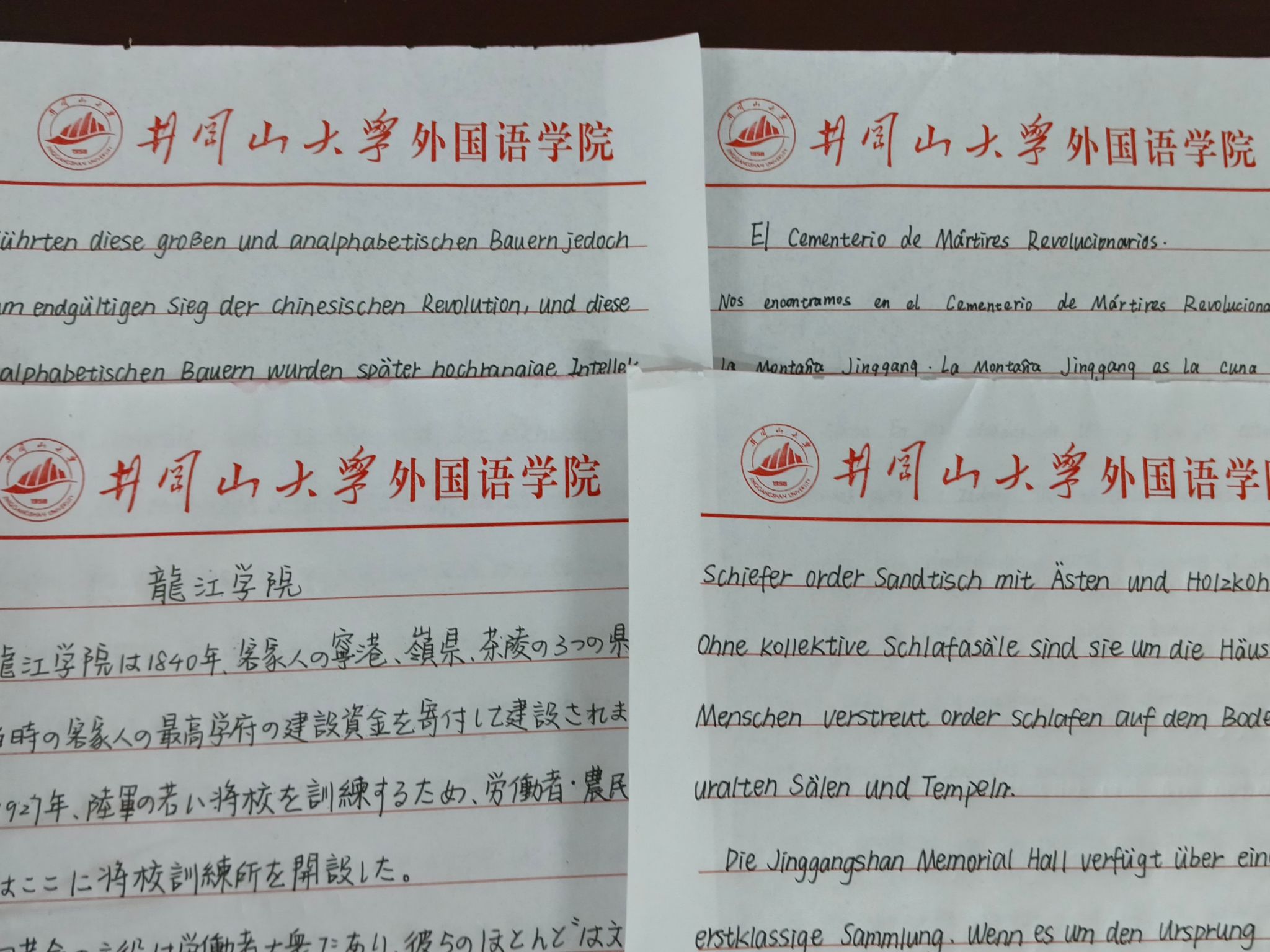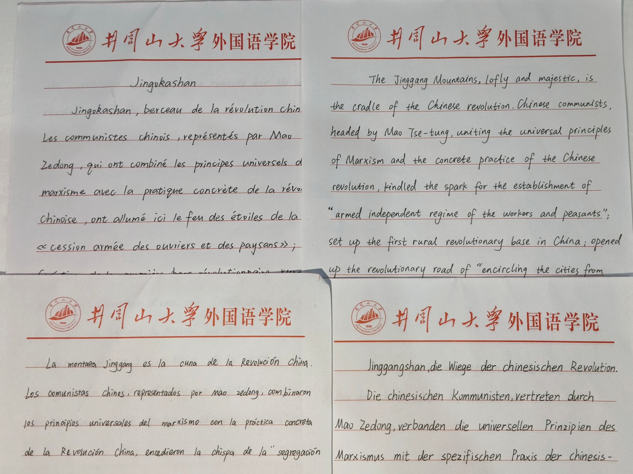 参观完井冈山革命博物馆、毛主席故居和龙江书院后,社会实践团队把实践感悟带回基地,并将调研成果与专业知识相结合,翻译成英语、法语、德语,西班牙语等多种语言,努力学以致用、用以促学,推动红色文化的国际化传播,为讲好中国故事贡献青春力量。