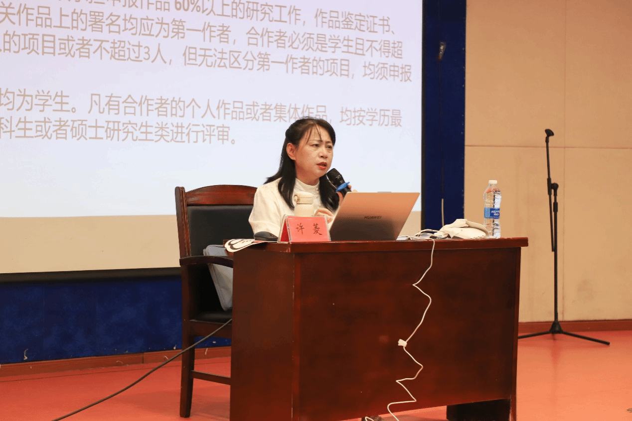 培训会上,许菱教授以《“挑战杯”全国大学生课外学术科技作品竞赛介绍及准备》为主题,从“挑战杯”是什么、“挑战杯”如何准备、“挑战杯”项目怎么去做三个方面向同学们系统地介绍了“挑战杯”竞赛,提出跨专业、跨学院的组队的专业建议,解决了同学们就“挑战杯”竞赛是否可以迭代参加问题的误区。许菱教授对自然科学类作品、哲学社科类作品和科技发明制作类等三个赛道作品如何选题、评审要点、论文或报告的撰写进行阐述和讲解,对如何打磨“挑战杯”作品给出实质性的见解,就如何展现作品问题,提出了作品要有主体、要有实招、要有匹配性、要有必要性、成果支撑、作品审美、现场答辩必不可少。她还对“揭榜挂帅”“黑科技”“红色专项”赛道也进行了简单讲解。最后,许菱教授与同学们分享了自己对“挑战杯”竞赛的心得体会,她强调好的作品是有发现并提出问题的能力、综合实践能力、逻辑思维与写作能力、口才和表达能力且是以学生成果为主的。