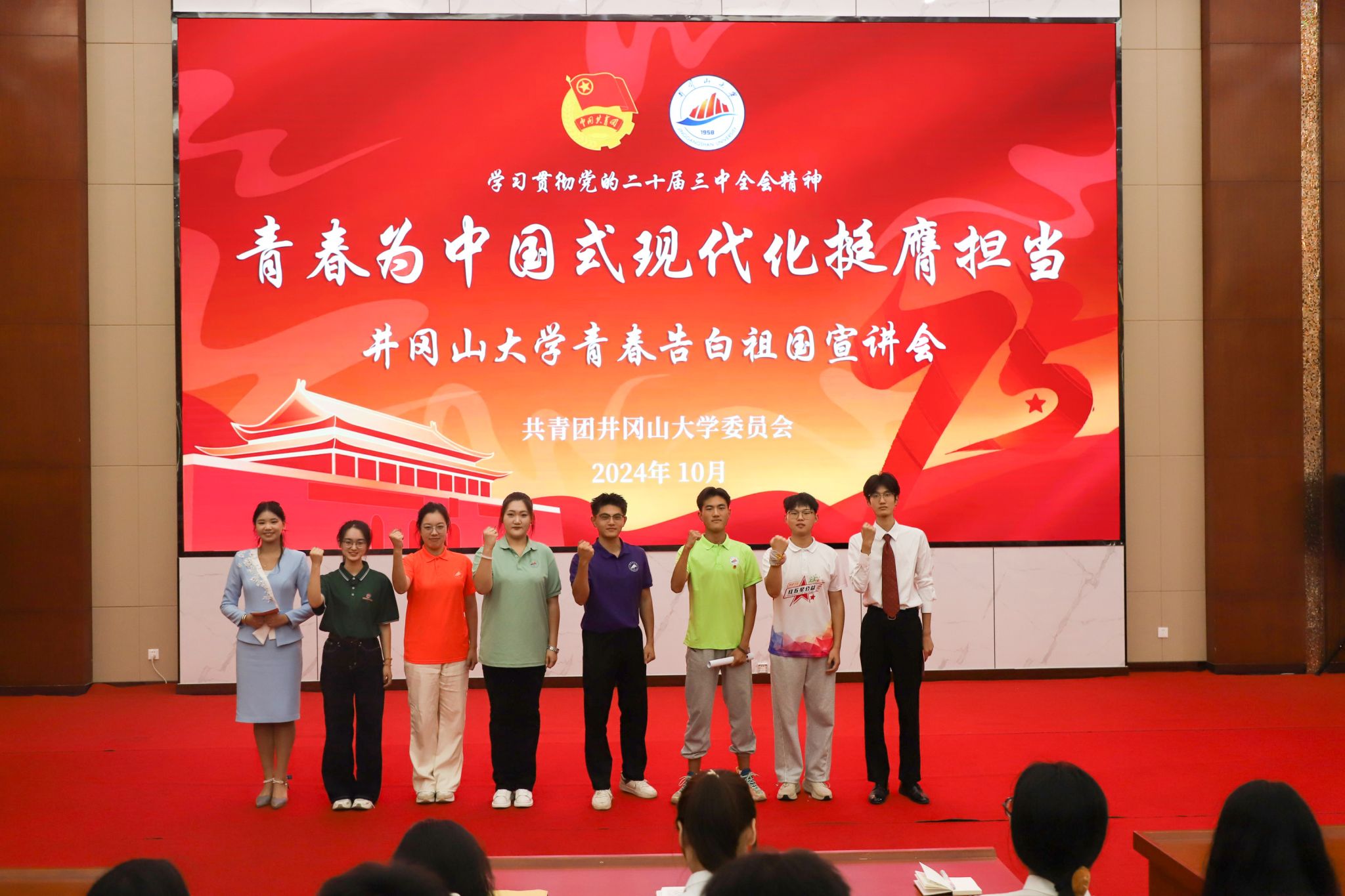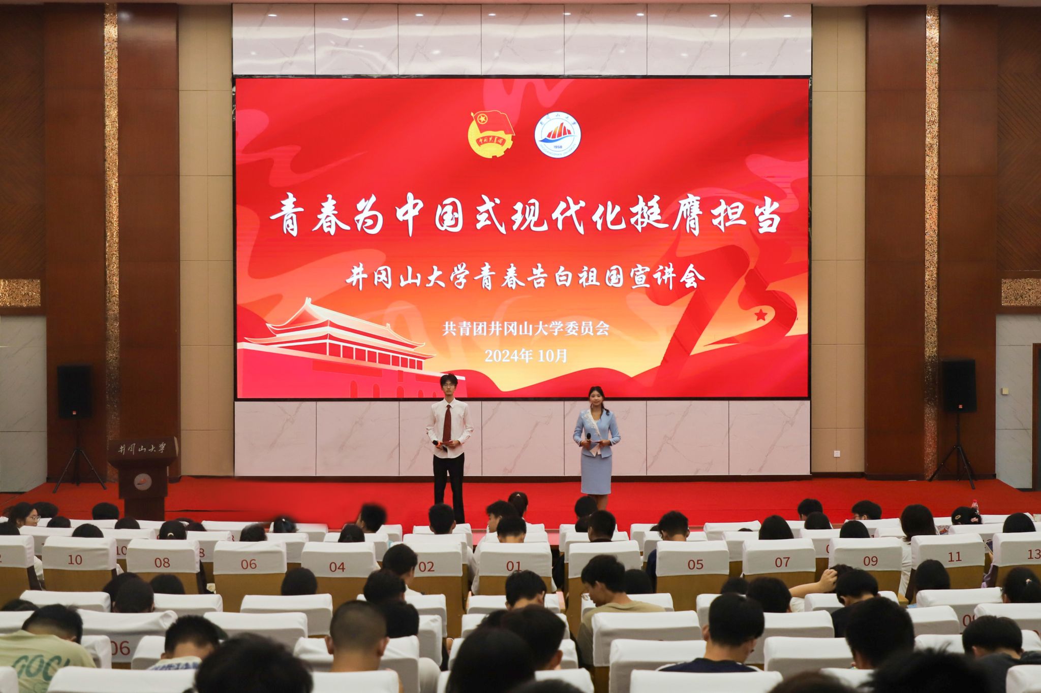 为深入学习贯彻党的二十届三中全会精神,厚植青年学生爱国主义情怀,展示井大学子与祖国共奋进的青春故事,10月17日下午,井冈山大学团委组织的“青春为中国式现代化挺膺担当”——青春告白祖国宣讲会在新图书馆报告厅举行。校团委学生会工作人员,“青马工程”大骨班学员,青年学生代表300余人参加了此次活动。