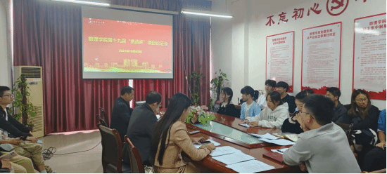 为激发青少年的创新能力和实践能力,推动高校科技成果转化与学研结合,10月28日下午,数理学院在10D309会议室召开第十九届“挑战杯”项目论证会。学院副院长周身林、副院长曾招云、党委副书记涂凰、各参赛队师生代表参加会议。