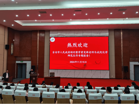 为帮助化学专业师范生加深对教师职业的认识,拓展学科视野,提升专业素养,2024年11月15日晚,吉安市人民政府特约督学、中学高级教师曾宪锋应邀来化学化工学院以“如何成为一名优秀的教师——政策、理念与实践”为主题为化学师范生作专题报告。本次报告在新图书馆一楼学术报告厅举行,由学院党委书记康云峰主持,化学系副主任叶慧贤、化学专业负责人杨黄根及化学教学论专业教师和2021级、2022级化学师范生共计240余人参加了此次报告会。