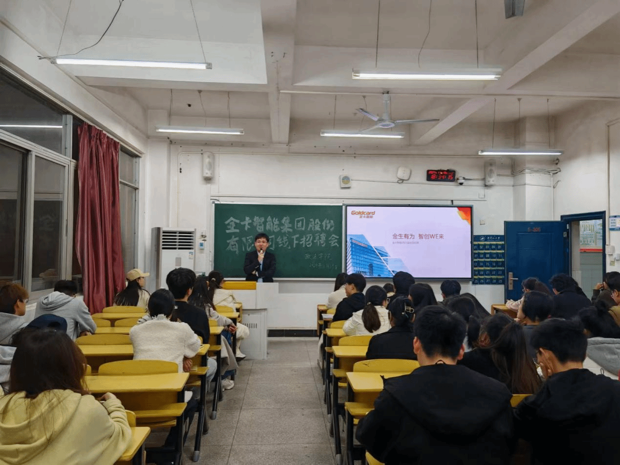 宣讲会现场,江旭标围绕公司概况、实力、业务等方面,详细讲解了金卡智能集团的核心产品、业务范围以及未来发展规划,让同学们对金卡智能集团有限公司的基本情况有了更为深入的了解。在交流环节,江旭标就同学们关心的实习和薪酬福利等方面的问题逐一进行解答,极大地激发了2025届毕业生们的求职热情。