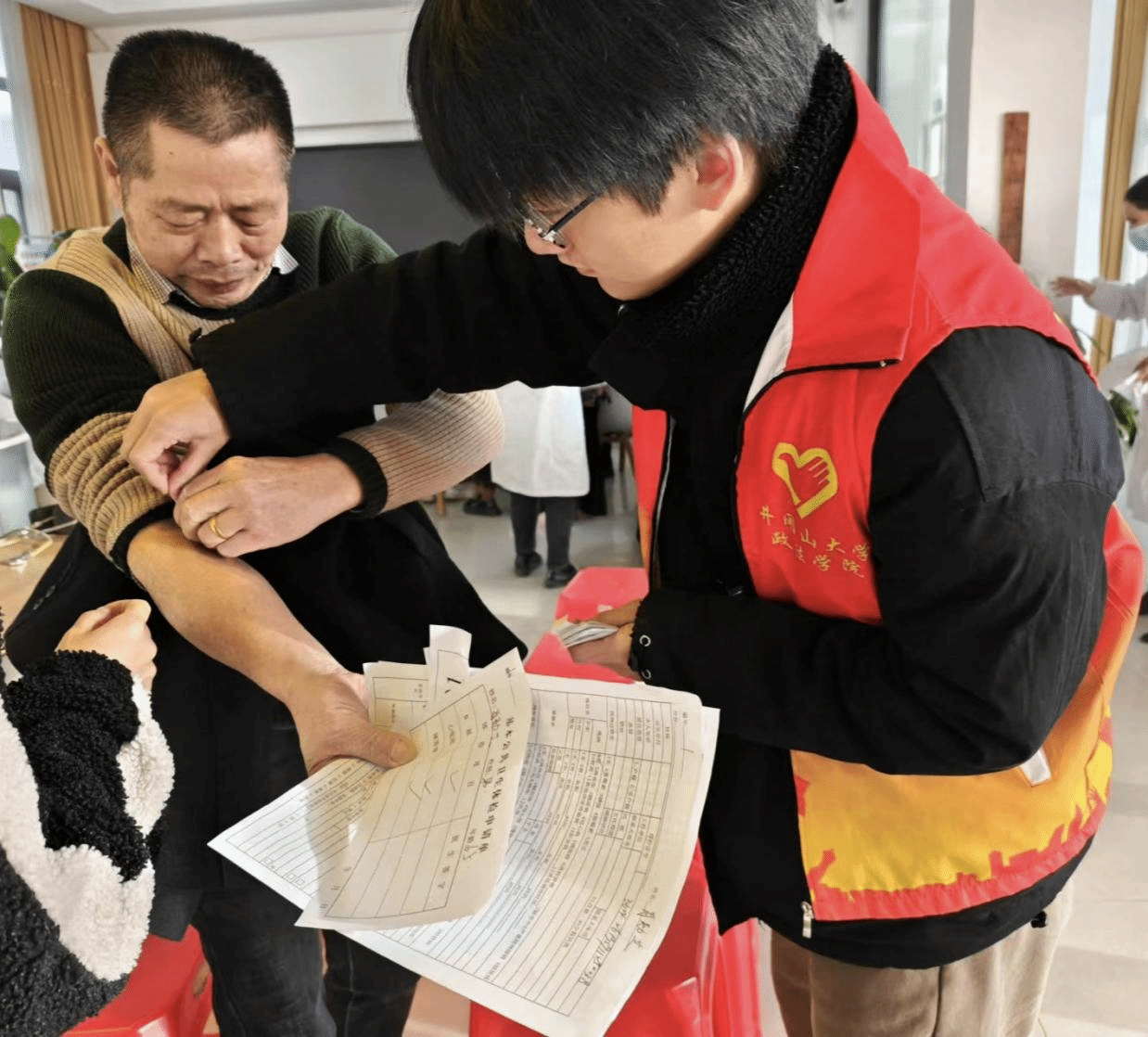 为传承和弘扬“尊老、敬老、爱老”的传统美德,保障老年人身体健康,2024年11月30日早8时许,迎着朝阳,井冈山大学政法学院学生第一党支部联合河东社区卫生服务中心,前往科教社区党群服务中心共同开展了“关爱老人,健康同行”老年人免费体检活动。
