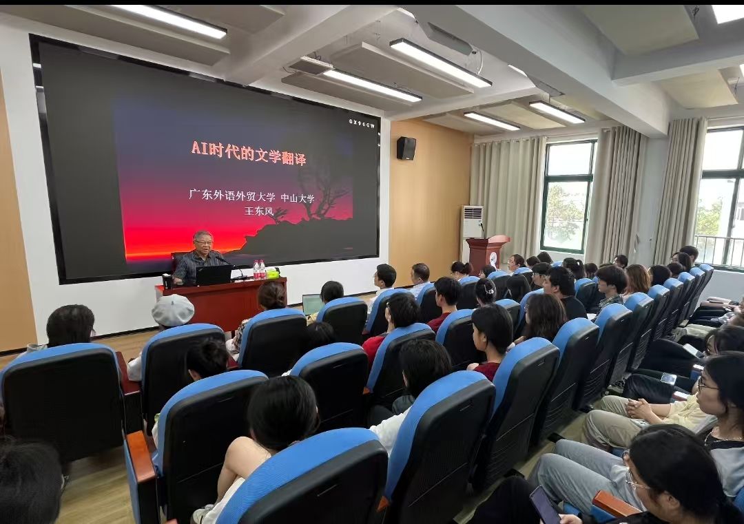 王东风教授的讲座题目为“AI时代的文学翻译”,深刻地揭示人工智能在文学翻译中的局限性,并展示人智交互的翻译新范式。讲座以生动形象的案例,富有趣味的解说,赢得全场听众的热烈反响。引导师生们即破除盲目的技术崇拜,又指明了人智交互的翻译实践路径,坚定了他们成为“翻译人”的信心。