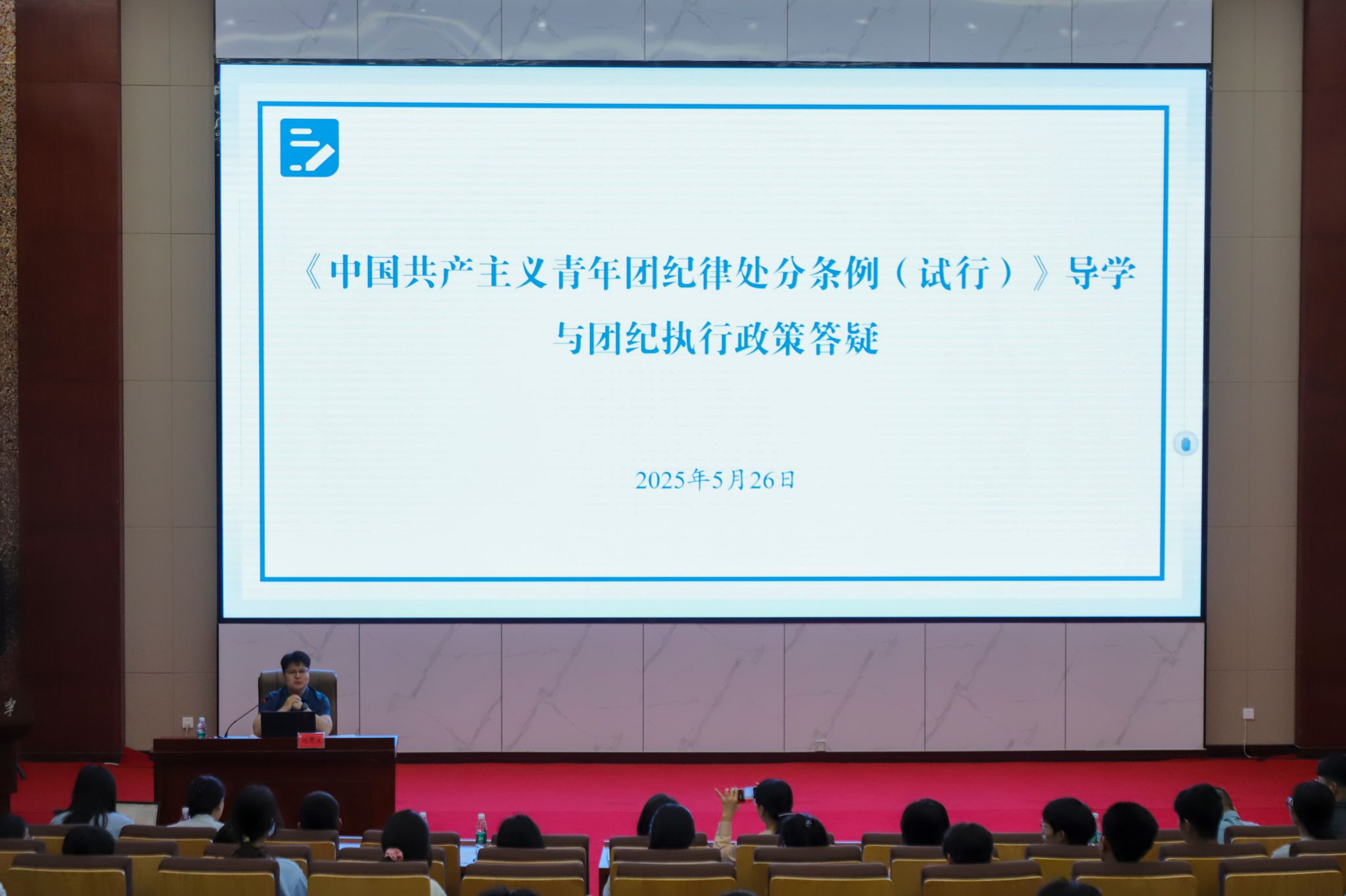 为切实加强团组织纪律建设,提高团干部和团员青年的纪律意识与政策执行能力,5月26日上午,我校在新图书馆报告厅举行《中国共产主义青年团纪律处分条例(试行)》导学与团纪执行政策答疑培训会。邀请了团中央组织部考评与纪律监督处副处长刘贯文担任主讲,校团委全体成员,各学院团委书记和负责人,校院团委组织部工作人员,各学院2024级团支部书记代表近300人参加培训。