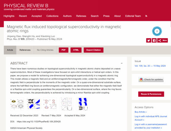 数理学院肖进鹏博士团队在中科院二区期刊、凝聚态物理专业顶级期刊《Physical Review B》上发表题为“Magnetic flux induced topological superconductivity in magnetic atomic rings”的理论研究文章。