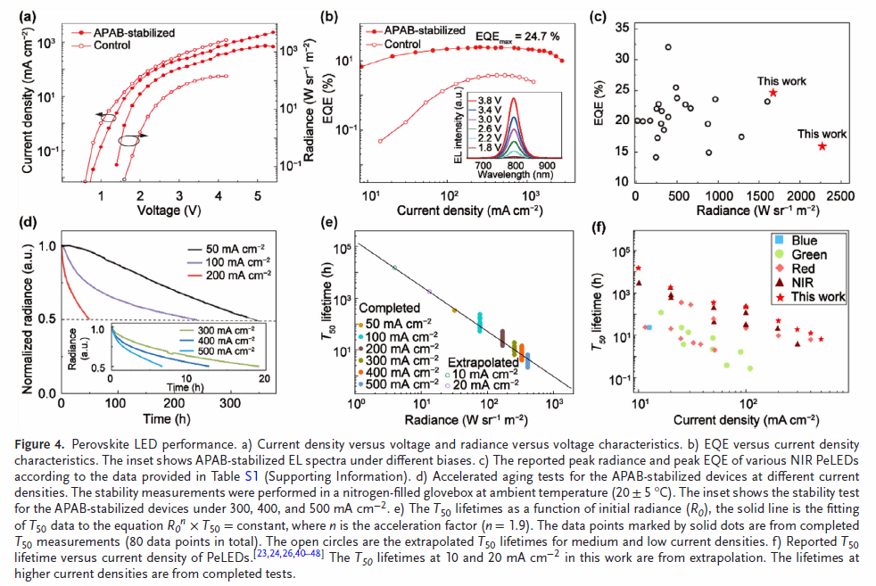 该研究的核心在于通过采用一种含有甲脒基团的多功能稳定剂APAB,成功开发了具有更高热耐受性的钙钛矿材料,能有效防止α-FAPbI₃钙钛矿在高温下的相变和分解。基于此,钙钛矿发光二极管(PeLED)实现了约24.7%的峰值外量子效率(EQE),并在70至1200 mA cm⁻2的宽电流密度范围内,EQEs保持在20%以上。器件的最大辐亮度为2270 W sr⁻¹ m⁻2,是目前近红外PeLEDs迄今报道的最高值之一。在高电流密度下内保持高EQE是实现超高辐射亮度的关键。此外,含有APAB器件表现出优异的工作稳定性,在不同恒定电流密度下寿命(T₅₀)显著提升:500 mA cm⁻2时为6.6小时,400 mA cm⁻2时为12.7小时,300 mA cm⁻2时为19.2小时,200 mA cm⁻2时为49.5小时,100 mA cm⁻2时为238.6小时,50 mA cm⁻2时为350小时,这是迄今报道的最稳定的PeLED之一。(图/文:王兆亿; 审核:刘诚、陈文通)