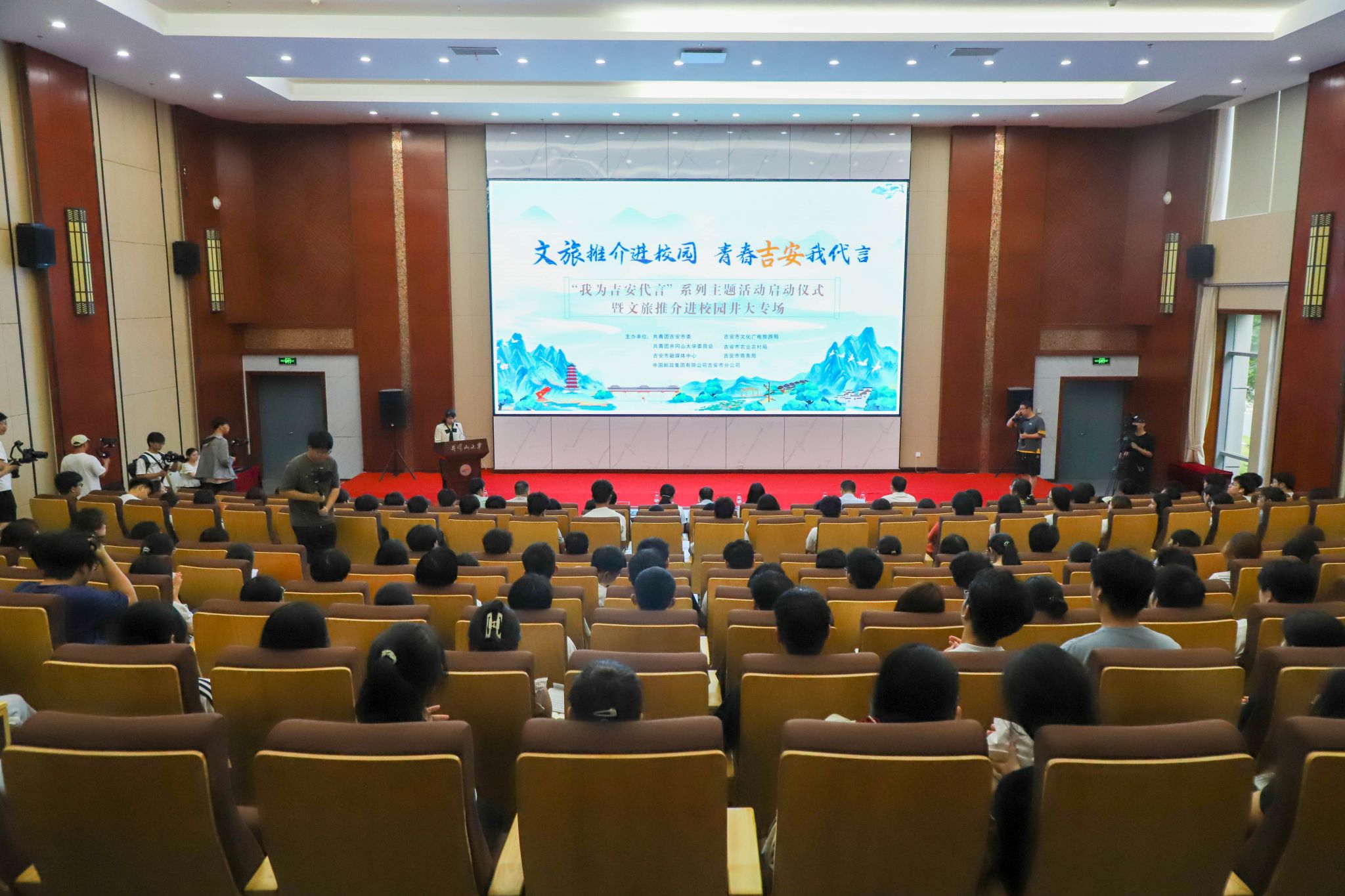 敖四江致辞,表示学校将以此次活动为契机,进一步深化校地合作,组织更多青年学生走进吉安的山水人文,用青春智慧为吉安“十大攻坚战”贡献力量。主办方代表详细介绍了“我为吉安代言”系列主题活动的丰富内涵与参与途径,同时号召广大青年学子以文化基因铸魂,做“知吉安”的深耕者;以青春创意赋能,做“爱吉安”的宣传者;以躬行实践助力,做“兴吉安”的行动者,在深入了解吉安厚重历史文化和丰富资源禀赋的基础上,将个人成长融入服务吉安发展大局,积极担当宣传推介的生力军。最后,活动在大家的共同见证下正式启动。