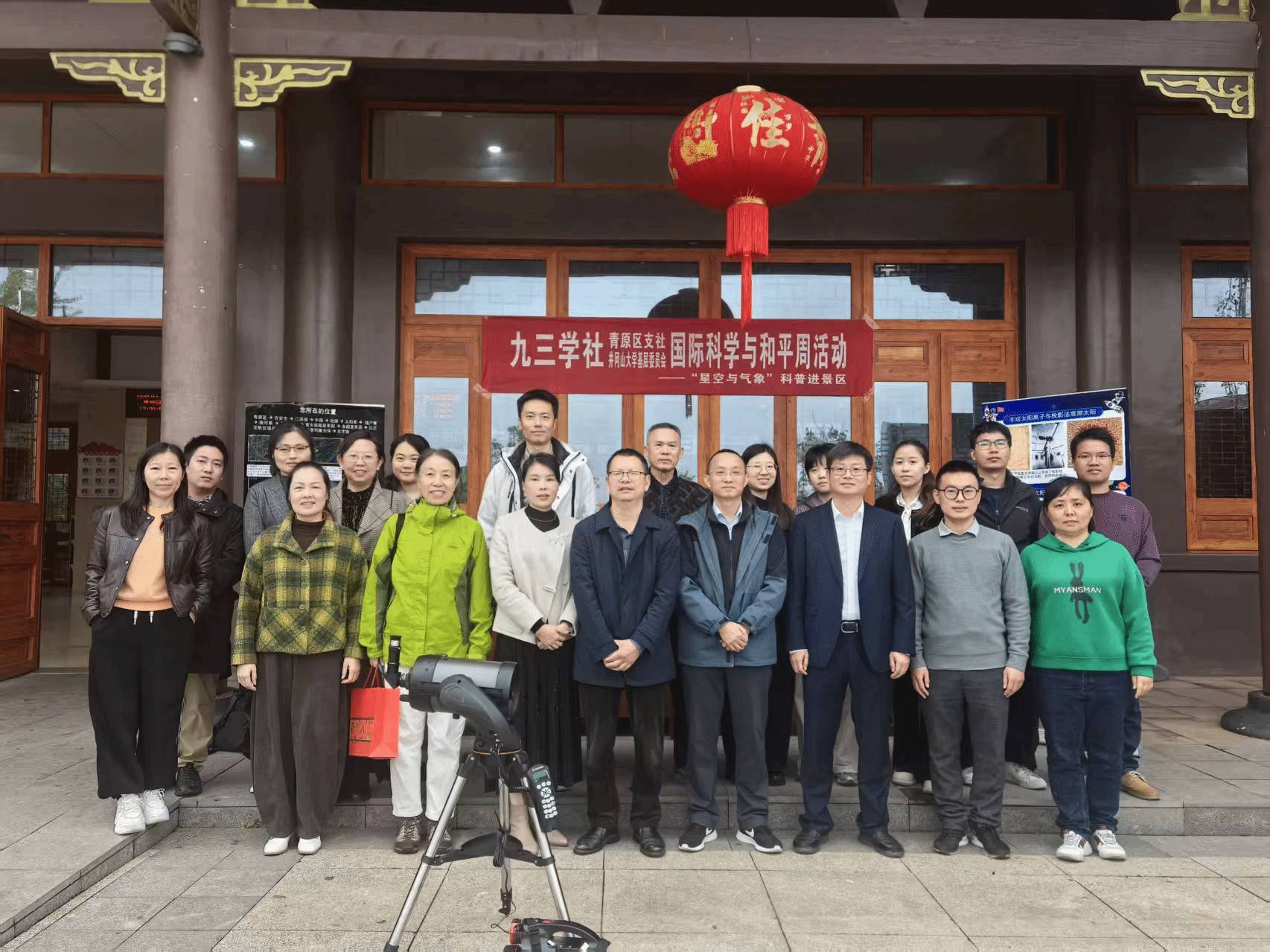 上午9时,作为九三学社国际科学与和平周系列活动的重要组成部分,“星空与气象”科普进景区活动在青原山游客中心广场启动。社员志愿者通过科普展板展示、宣传资料发放、现场互动讲解等方式,向过往游客普及天文气象知识、展示科技创新成果、弘扬科学精神。活动持续一小时,吸引众多游客驻足参与,充分发挥了九三学社科技界别优势,为提升公众科学素养注入力量。