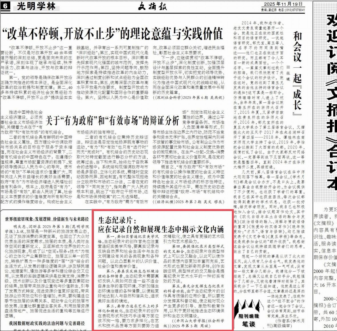 《井冈山大学学报(社会科学版)》2025年第5期刊发的学术论文《在记录自然和展现生态中揭示文化内涵——关于国产生态纪录片创作的美学思考》被《文摘报》摘录于2025年11月19日第6版“光明学林”,摘录题目为《生态纪录片:应在记录自然和展现生态中揭示文化内涵》。这是学报刊文本年度第三次被《文摘报》摘录。