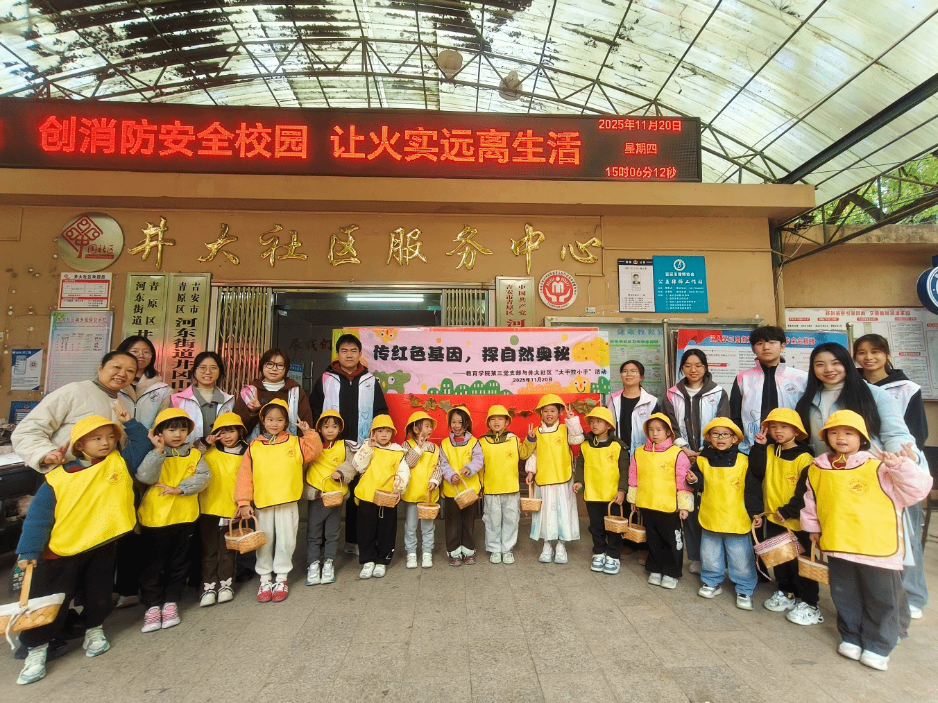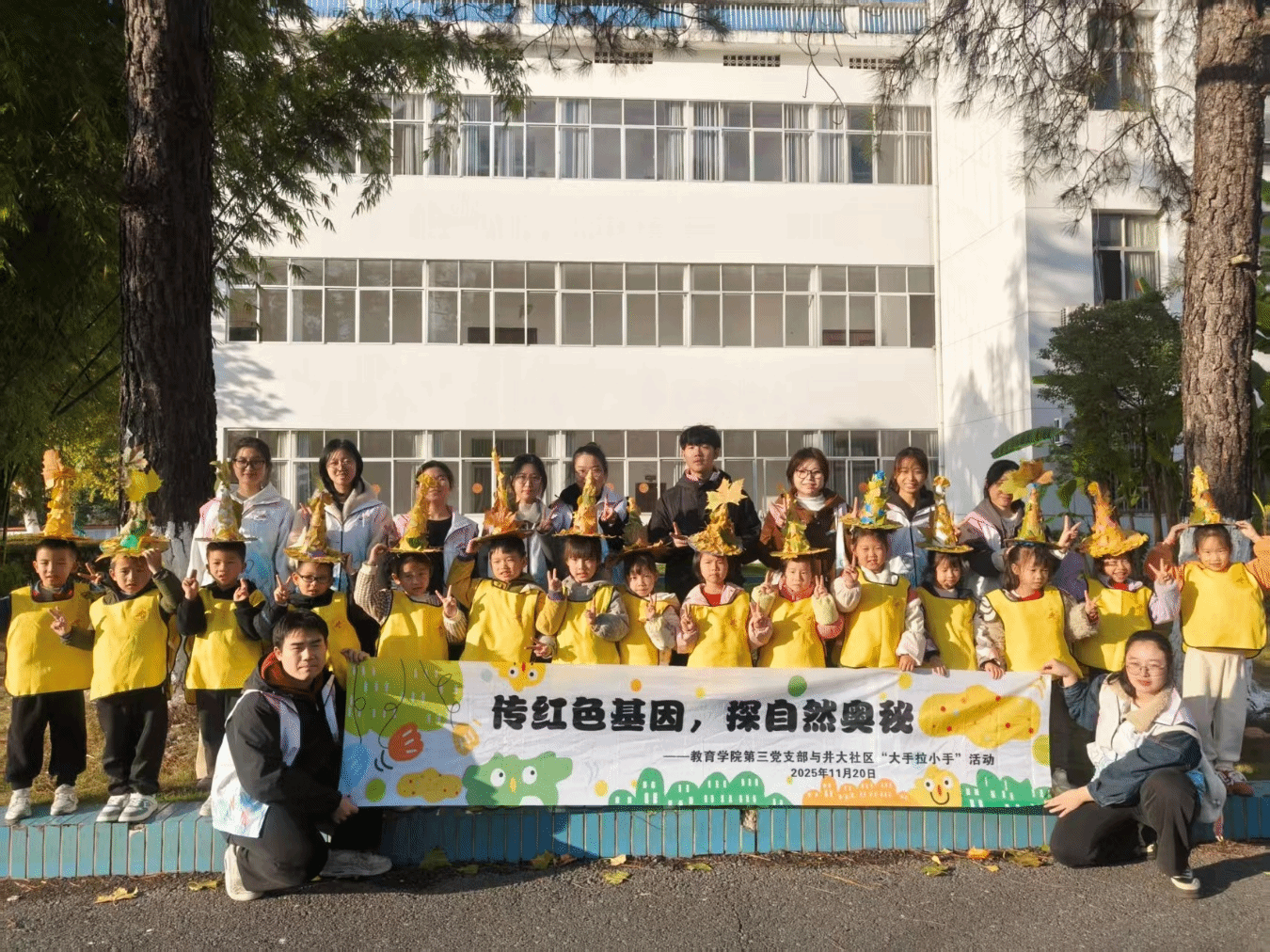 为传承红色基因,播撒科学种子,11月20日下午,教育学院第三党支部与井大社区联合举办了以“传红色基因,探自然奥秘”为主题的“大手拉小手”实践活动。