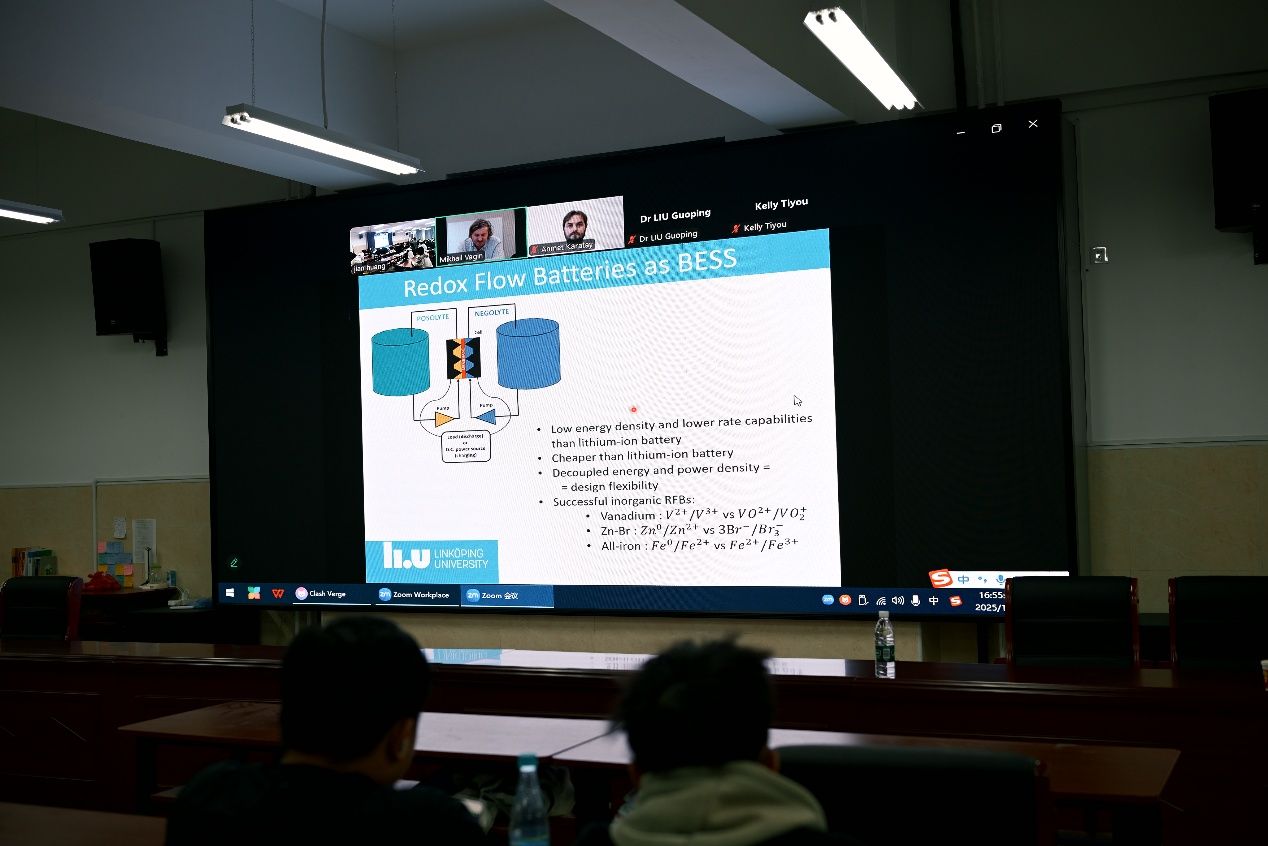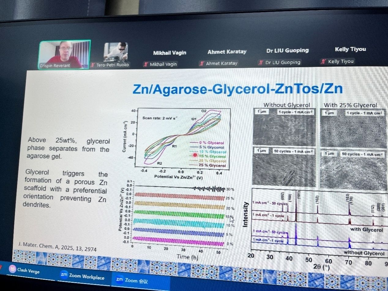 瑞典林雪平大学Reverant Crispin教授和Mikhail Vagin副教授围绕能源存储问题分别作了题为“Towards printed zinc-lignin batteries”和“Quinones in redox flow batteries: ion-selective mass transfer, degradation and crossover”的报告。Reverant Crispin教授首先详细介绍了团队基于绿色生物质材料的印刷锌-木质素电池的研究工作,该团队通过将木质素与碳或导电聚合物复合,成功设计出性能优异的木质素电极;其次,创新性地采用 “聚合物盐包水电解质” 体系,有效解决了水系有机电池自放电率高的问题,为电池稳定性提供关键支撑;最终,将这些创新材料与结构集成,研发出兼具稳定性与应用潜力的锌-木质素电池,且该电池可与印刷技术适配,完美契合印刷电子设备的生产与应用需求,该项研究为能源存储领域的可持续发展提供了新思路。而Mikhail Vagin副教授的报告聚焦大规模储能装置-液流电池,尤其是醌类液流电池中性能衰减的难题,介绍了团队在这一课题上进行的实验和理论模拟成果,例如通过隔膜材料改性降低被动扩散渗透性,利用核磁共振技术检测并建模分析醌类迈克尔加成反应(MAR)及反应机理。