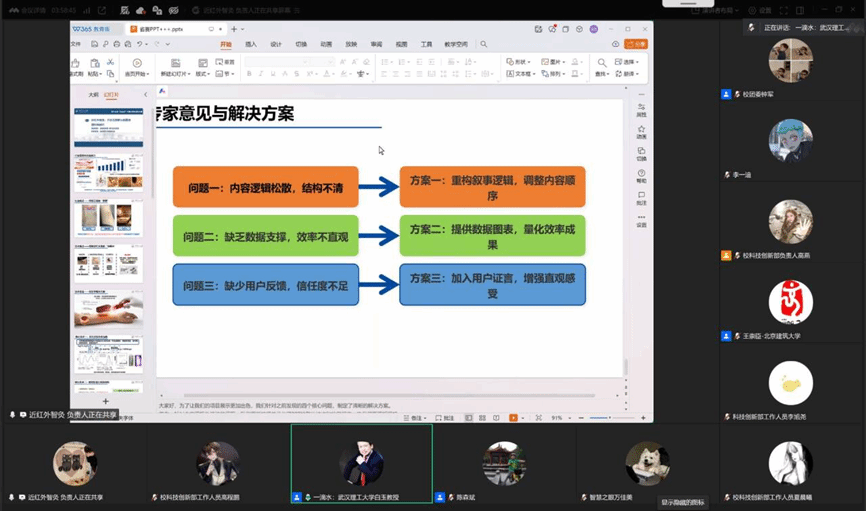 评审过程中,三位校外专家立足赛事要求与行业前沿,对各项目进行全面、深入、专业的点评指导。专家们充分肯定了各项目相较前期打磨取得的显著进步,以及项目选题紧扣国家战略需求、立意较高的突出亮点;同时精准指出项目在痛点挖掘、技术创新表述、逻辑闭环构建、数据支撑严谨性、PPT呈现设计、商业转化证据等方面存在的共性问题,并针对每个项目的个性短板给出具体改进建议,为项目后续精准打磨、提质升级指明了清晰方向。
