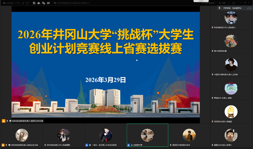 为遴选优质创新创业项目代表我校冲击2026年“挑战杯”大学生创业计划竞赛省级赛事,精准提升项目核心竞争力,3月29日,我校 “挑战杯”大学生创业计划竞赛线上省赛选拔赛顺利举办。来自武汉理工大学、北京建筑大学、华中科技大学的评审专家,以及校团委书记郭敏娜出席活动。20支校赛优胜项目团队、各学院团委负责人及校科技创新部工作人员全程线上参与。