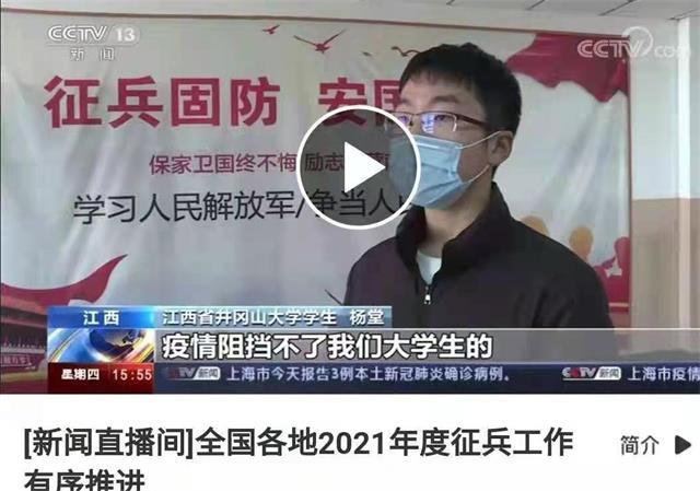 [同期声]江西井冈山大学学生杨堂:疫情阻挡不了我们大学生的爱国心报国情,我们希望能够顺利通过体检,到部队的大熔炉里去淬火成钢,为实现强军强国梦奉献自己的青春和力量。以下为视频链接地址: