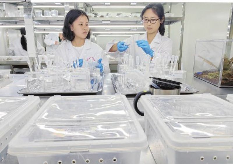 近年来,井冈山大学生命科学学院的蜘蛛研究团队将蜘蛛人工投向试验田,利用繁育蜘蛛控制害虫生长,实现了30余亩稻田完全绿色无公害化。目前,试验田基地扩大种植规模,力争通过稻田蜘蛛试点推动高端农产品生产,促进当地农业提质增收。图为近日井冈山大学蜘蛛团队项目组成员正在进行蜘蛛繁育研究。记者郭文宇摄