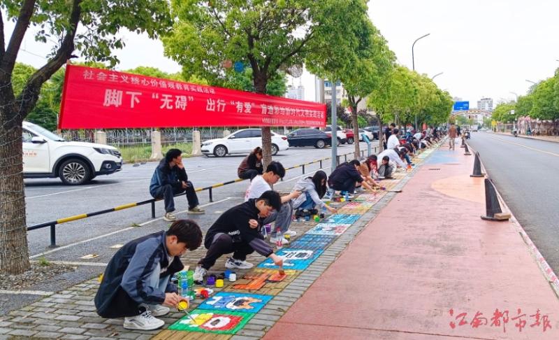 江南都市报讯 蒋丽、全媒体记者章娜摄影报道:4月20日,记者从井冈山大学获悉,4月17日,中共吉安市青原区委宣传部联合井冈山大学艺术学院、井冈山大学红五星残健共融公益中心,在吉安市奥克南门小街开展脚下“无碍”、出行“有爱”盲道彩绘新时代文明实践活动,100余名学生志愿者参加此次活动。