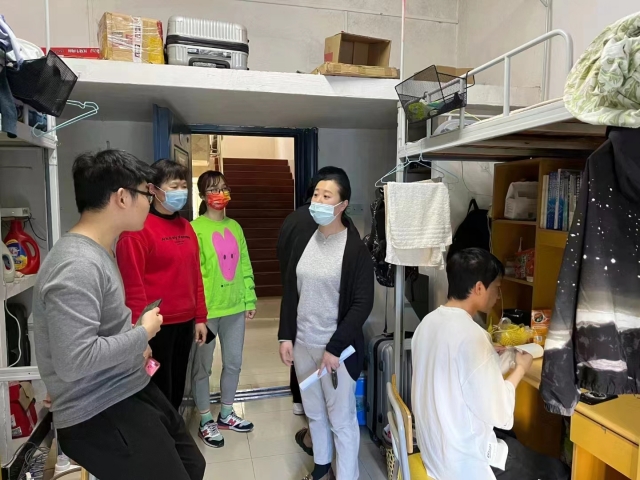 “在接到通知后,我们大概于9月4号下午一点钟之前就全部到位了,要做到这一点是非常不容易的,每位管理老师背后都承担着巨大压力。”周溪说道。鱼与熊掌难以兼得,面对疫情防控任务,在家庭与工作之间,周溪及其他辅导员毅然选择了后者。周溪家中婆婆病重,丈夫需在医院照顾,母亲也患有高血压,家中孩子无人看管,为兼顾家庭与工作,她只能将孩子一同带入学校。学生科长李海栗也与周溪一样为了工作带娃入校。辅导员漆小凤,明年已到退休年龄,家中还有一位80多岁的老母亲需要照料,在接到入校通知后,还是第一时间响应学校号召迅速入校,将80余岁的母亲独自留在家,封闭管理的20余日,她母亲吃住都仰仗邻居帮忙。疫情迅急,工作繁重,周溪等人常常需要工作到深夜十一二点,这时往往无暇顾及孩子。“有时倒是孩子经常帮我带饭,成了我的生活小助手。”周溪笑道。在疫情形势尚不明朗之际,他们舍小家为大家,入住办公室、学生寝室,把家安在了学校,不辞陋室极简生活,不分昼夜服务师生,让学校疫情防控有了主力军、定心丸。