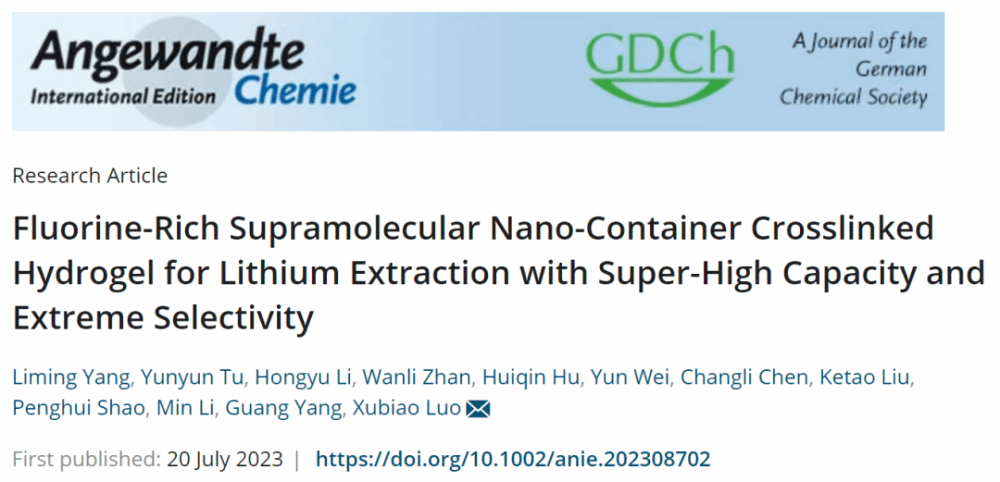 近日,我校校长罗旭彪教授团队在国家杰出青年基金项目、国家重点研发计划等项目的支持下开展研究,制备了一种新型机械坚固的、具备从含锂溶液中高效提取锂离子能力的富氟水凝胶。这种水凝胶由含氟单体、丙烯酸和少量化学交联剂的超分子纳米片通过聚合反应制得,具备出色的锂吸附能力(Qm Li+ = 122.3 mg/g),并且可以重复使用。此外,它还展现出从多种金属离子共存溶液中提取锂离子的能力,以实际废水为例,其Li+/Na+的分离系数达到了惊人的153....