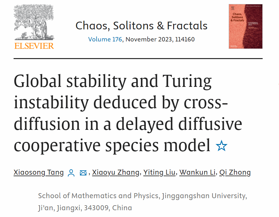 近日,我校数理学院汤小松博士团队在中科院1区Top期刊《Chaos, Solitons & Fractals》(IF=7.8,JCR分区Q1)上发表题为“Global stability and Turing instability deduced by cross-diffusion in a delayed diffusive cooperative species model”的研究论文。这是该团队继2020年在中科院1区Top期刊《Applied Mathematics Letters》后发表的又一篇高水平论文。研究得到了国家自然科学基金(12261050,62062042)、江西省教育厅科技项目(...