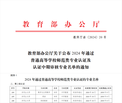 近日,教育部办公厅发文(教师厅函〔2024〕20号)公布2024年通过普通高等学校师范类专业认证的专业名单。我校数理学院数学与应用数学专业、外国语学院英语专业、体育学院体育教育专业通过教育部师范类专业认证第二级认证。截至目前,我校已有8个师范专业通过教育部师范类专业第二级认证且在有效期内,4个专业完成专家进校考查任务,实现了学校师范类专业专家进校考查全覆盖,学校师范类专业认证步调迅速、进展顺利。数学与应用数学、...