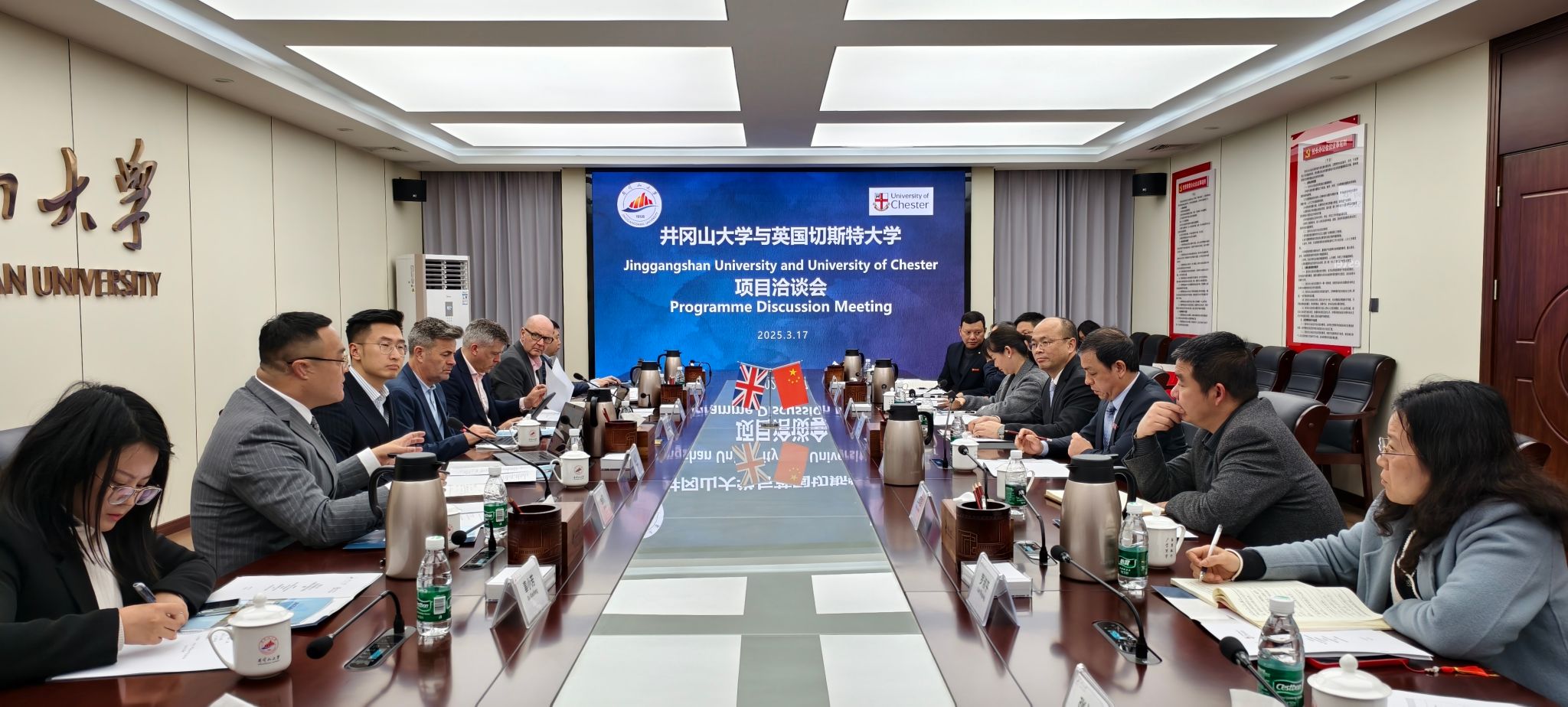 3 月 17 日,英国切斯特大学副校长(分管国际事务)大卫・麦克拉维、副校长柯特・奥尔曼(分管教学学术)、全球发展中心主任彼得・理查兹等一行7人来我校访问交流并开展项目洽谈。校党委常委、副校长黄族豪出席会议,国际合作与交流处、商学院、电子信息与工程学院、教务处、招就处相关负责人参会。黄族豪对英国切斯特大学代表团来访表示热烈欢迎,并简要介绍了我校办学的基本情况。他指出,英国切斯特大学办学历史悠久,学科优势明显,...