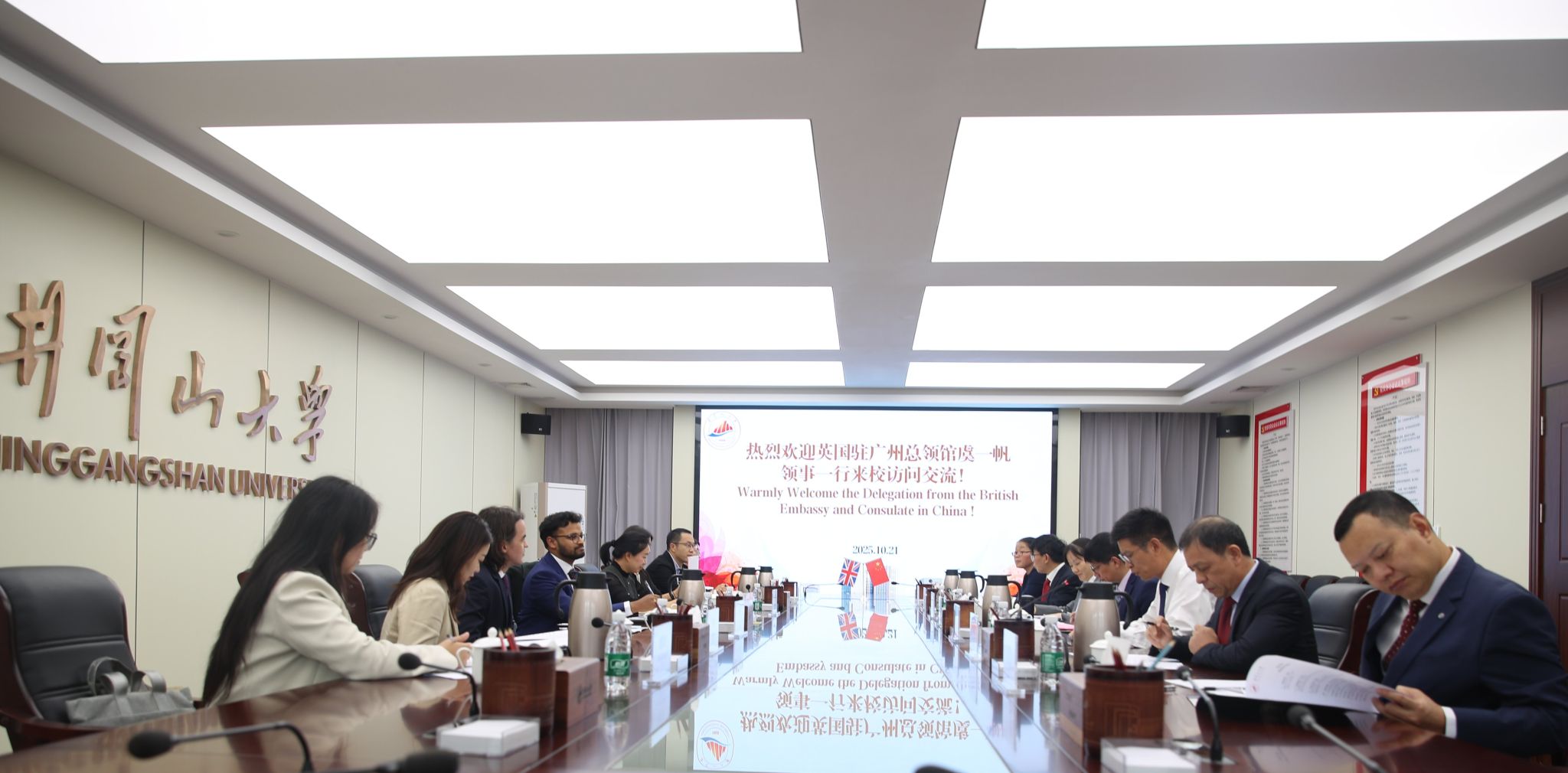 10月21日,英国驻华大使馆政务处一等秘书诺杰(Anojan Ratnarajah)、英国驻广州总领事馆华南区域合作领事虞一帆(Emma Meads)一行5人来校访问交流,省、市外办相关处室领导陪同。校党委书记罗旭彪会见访问团一行并出席交流座谈会,校长助理刘关俊主持会议,国际合作与交流处、井冈山研究中心相关负责人参加座谈。座谈会上,罗旭彪对诺杰一行的到来表示热烈欢迎,他以井冈山革命斗争时期的故事形式介绍了我校井冈山精神研究与传承的情况,...