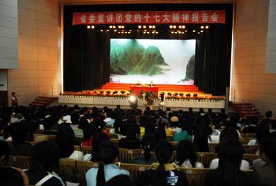 11月14日上午,省委宣讲团成员、省委党史研究室主任沈谦芳来我校宣讲十七大精神,1400余名师生到场聆听了报告。沈谦芳的宣讲受到了广大师生的热烈欢迎,引起了强烈的反响,也将进一步推动我校学习宣传贯彻十七大精神...