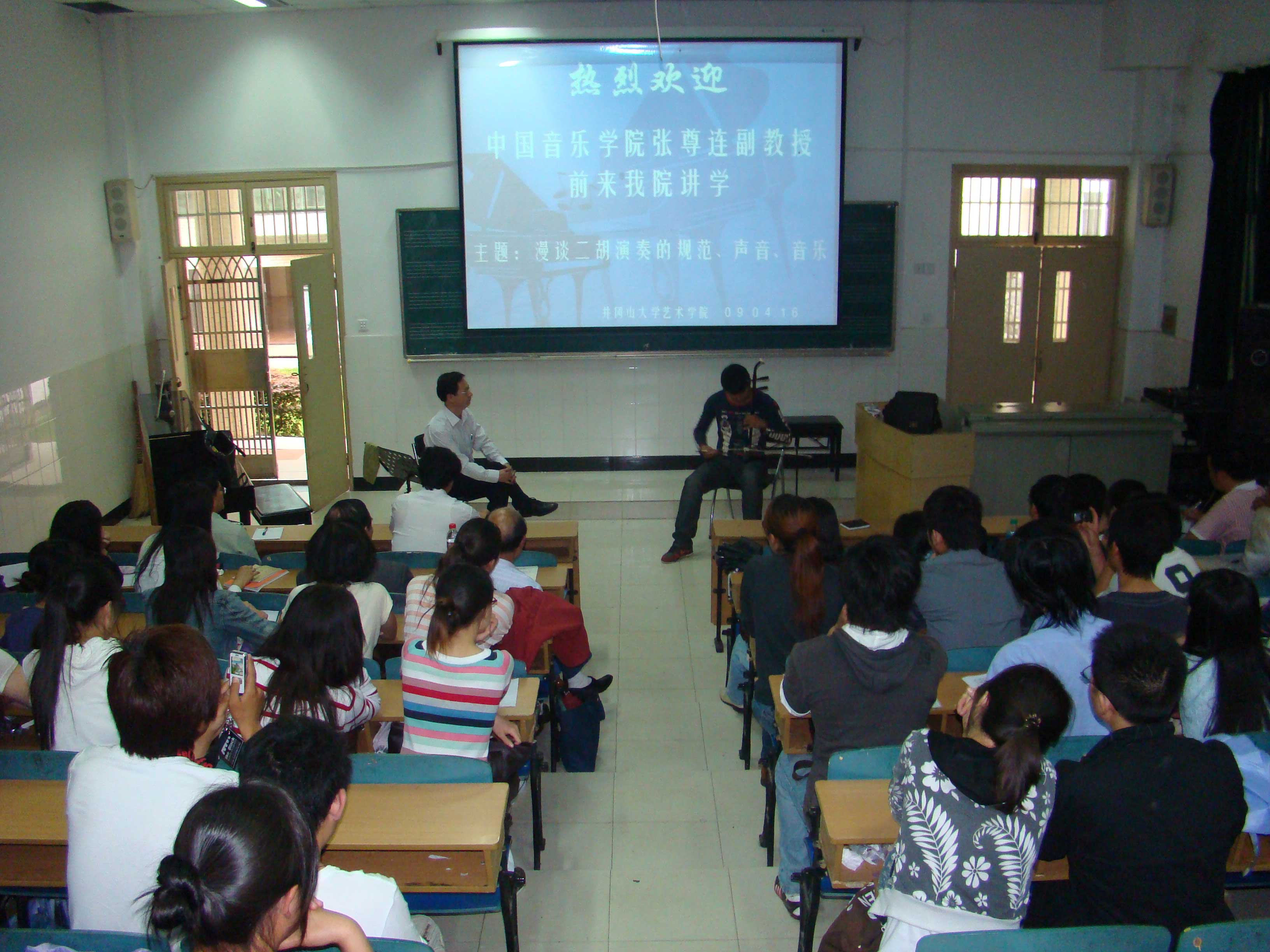 4月16日,中国音乐学院傅利民、张尊连二位教授在艺术学院为音乐系师生各举办了一场学术讲座。讲座由艺术学院院长彭一敏主持。傅利民教授讲学的主题为“音乐(学位)论文的选题与研究方法”,张尊连教授讲学的主题是“...