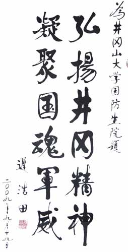 勉励国防生“弘扬井冈精神,凝聚国魂军威” 9月21日,原中共中央政治局委员、中央军委副主席、国务委员兼国防部长迟浩田上将,委托解放军总参谋部兵种部原政委田永清少将,将他专门为井冈山大学国防生学院亲笔题写的...