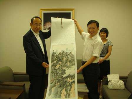 7月20日至21日,正在日本创价大学访学研究的我校副校长曾建平教授,分别拜会了该校理事长田代康则先生、校长山本英夫先生。 拜会田代理事长时,曾建平向池田大作先生赠送了我校艺术学院教师创作的国画“井冈山五指峰...