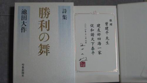 近日,池田大作先生委托前来中山大学参加“第六届池田大作思想国际学术研讨会”的创价大学有关人员带来了他赠送给我校副校长曾建平的其个人诗集——《胜利之舞》,并在扉页亲自题写“建友好四海一家,促和谐天下太平...