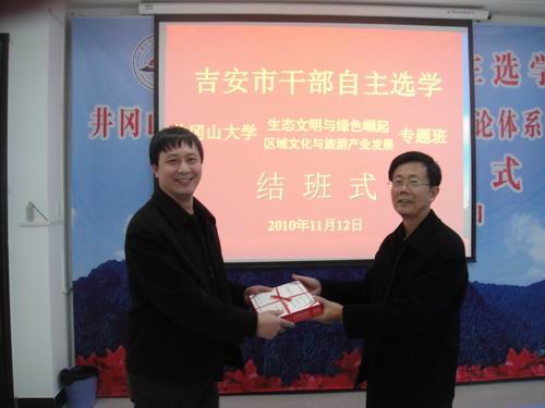 11月12日,吉安市干部自主选学——井冈山大学“生态文明与绿色崛起”、“区域文化与旅游产业发展”专题班结班仪式在我校举行。副校长罗学渭为来自全市市直机关的47名副科级以上干部学员颁发了结业证书。教务处处长黄...